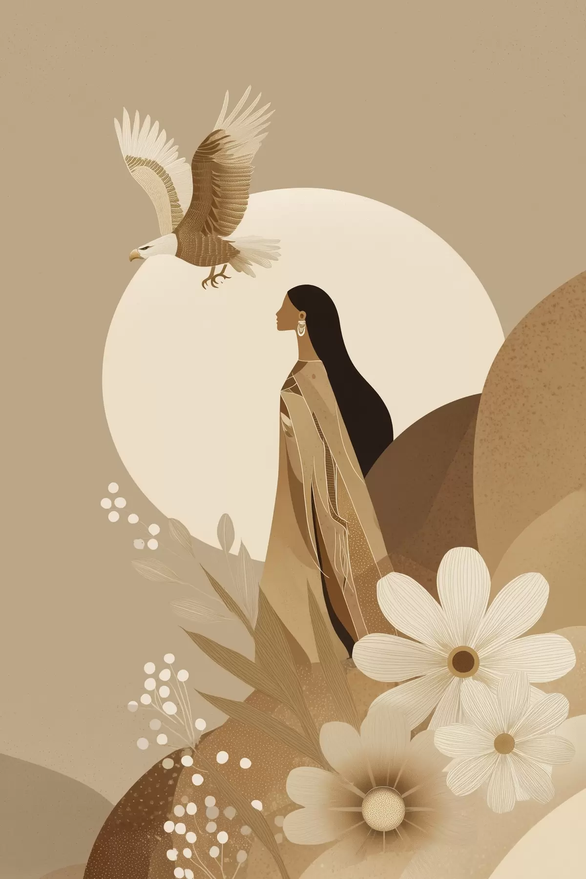 Affiche Abstraction avec femme et aigle dans le ciel, couleurs beiges f44978