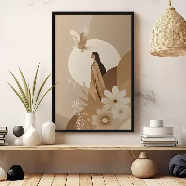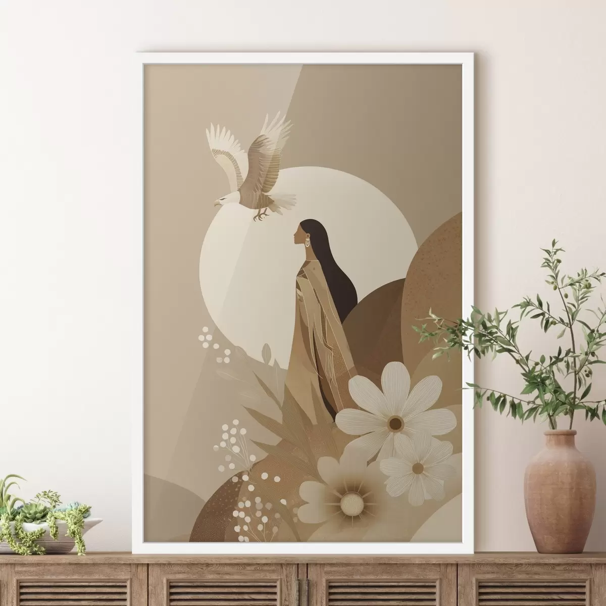 Affiche Abstraction avec femme et aigle dans le ciel, couleurs beiges Non f44978