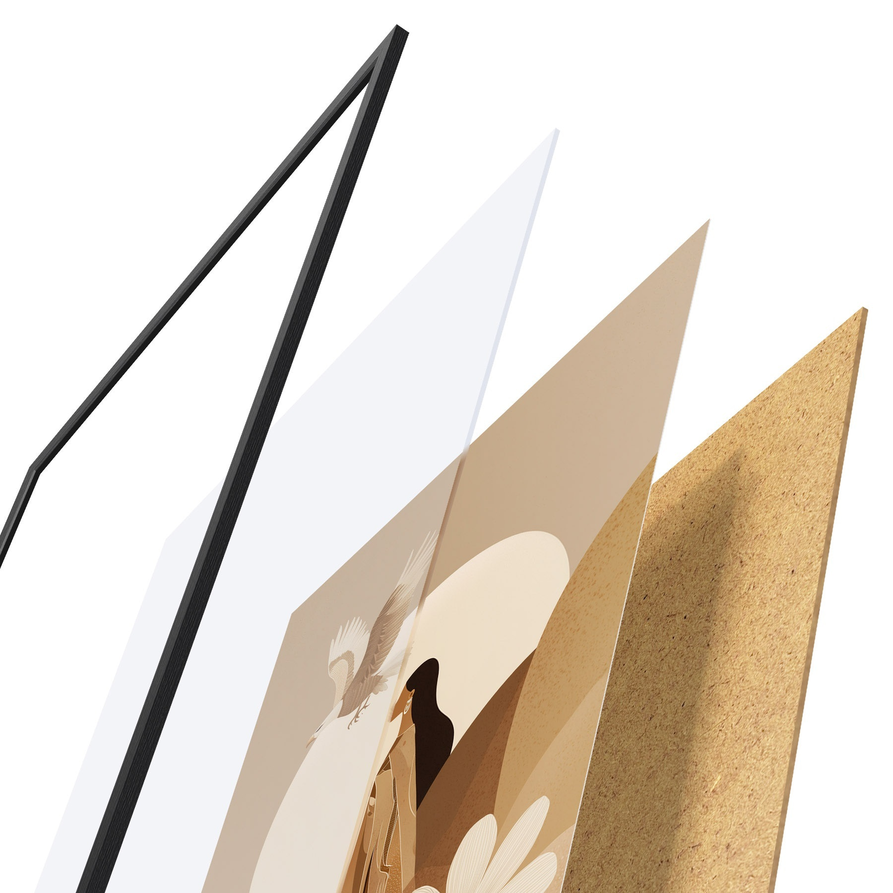 Le poster se compose d'un cadre, d'un plexiglas, d'une image imprimée et d'un support en aggloméré. Le poster peut être immédiatement accroché au mur grâce aux fixations au dos.