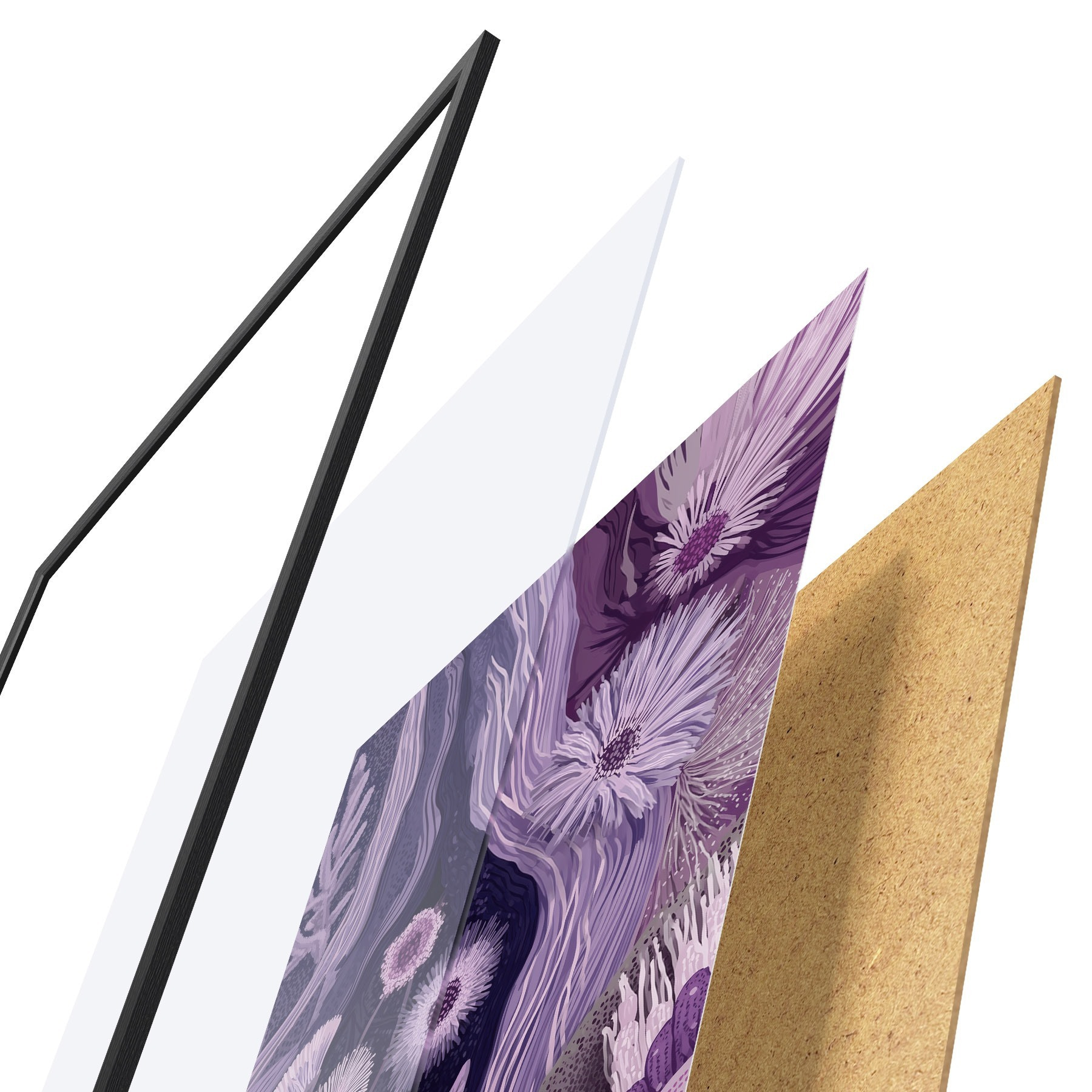 Le poster se compose d'un cadre, d'un plexiglas, d'une image imprimée et d'un support en aggloméré. Le poster peut être immédiatement accroché au mur grâce aux fixations au dos.