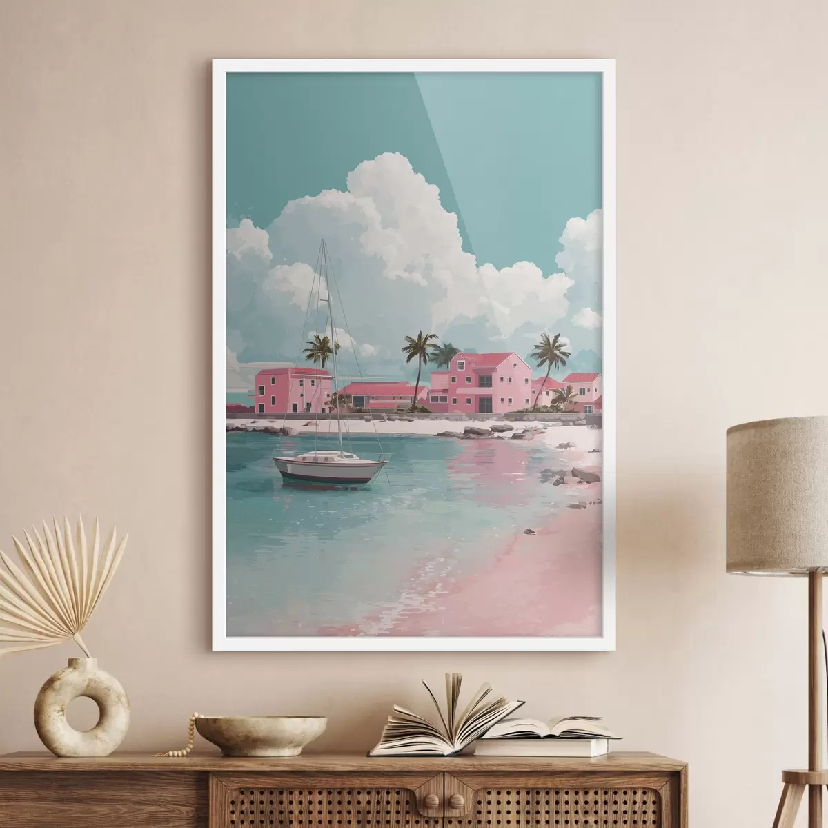 Affiche Plage rose avec soleil éclatant, voilier et maisons f44986
