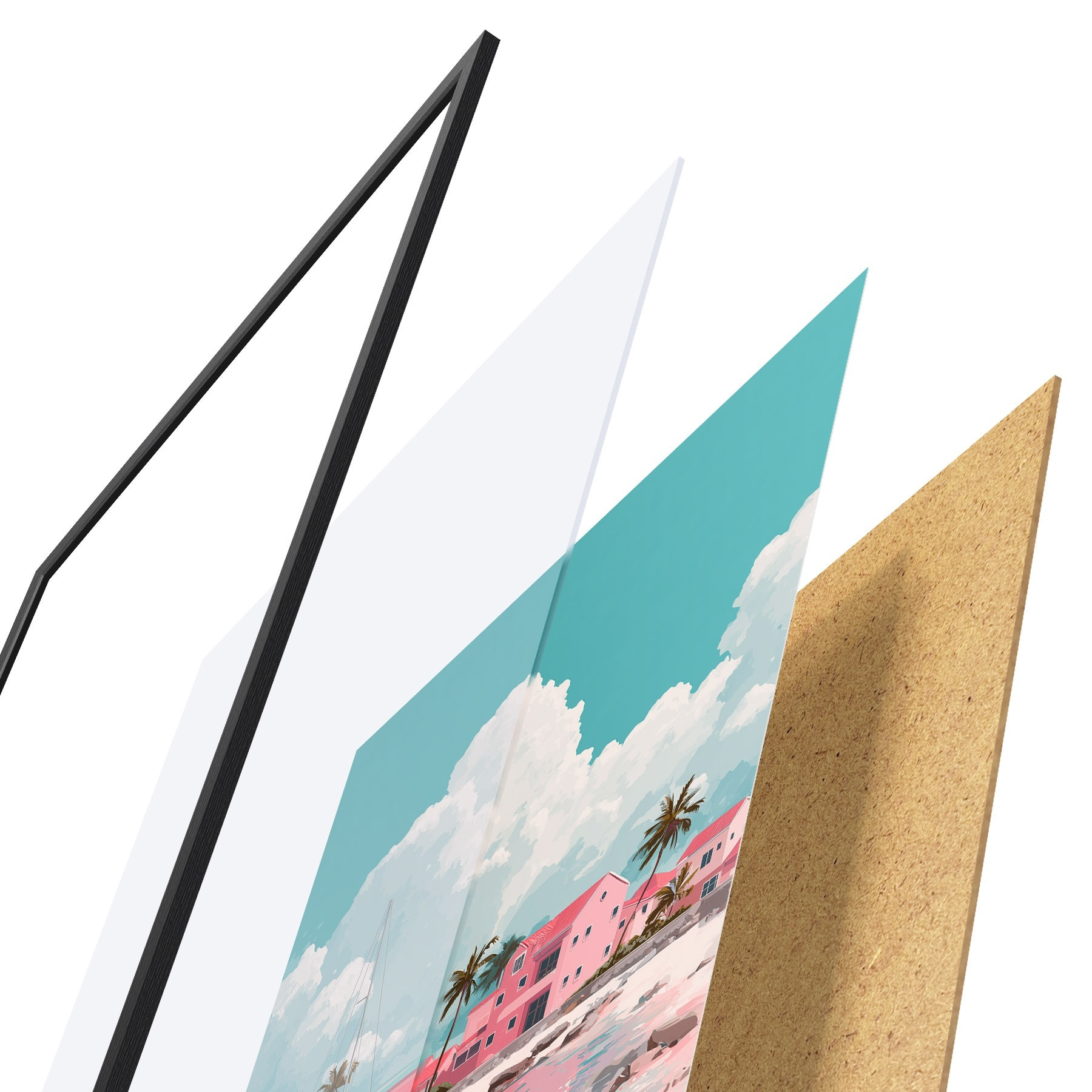 Le poster se compose d'un cadre, d'un plexiglas, d'une image imprimée et d'un support en aggloméré. Le poster peut être immédiatement accroché au mur grâce aux fixations au dos.