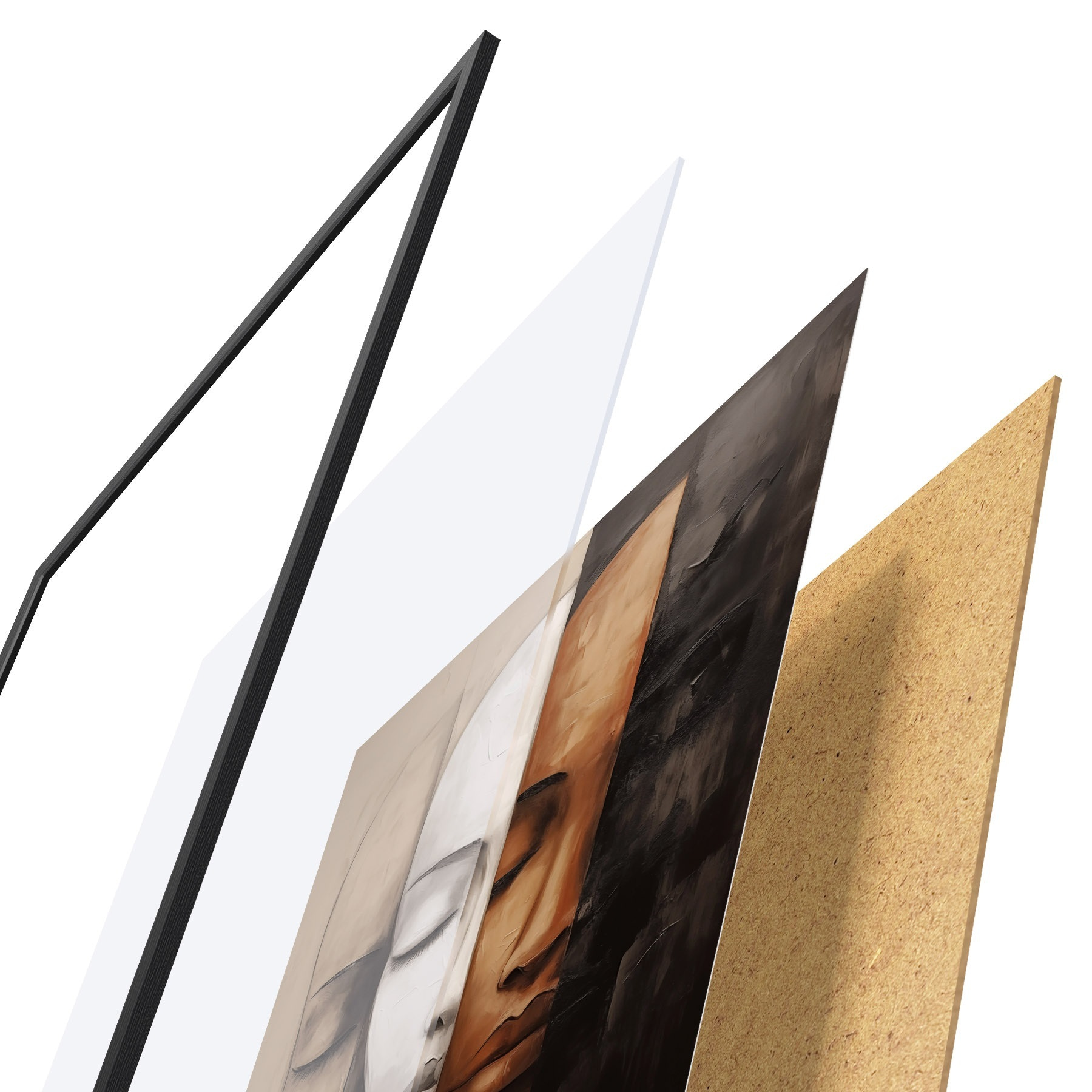 Le poster se compose d'un cadre, d'un plexiglas, d'une image imprimée et d'un support en aggloméré. Le poster peut être immédiatement accroché au mur grâce aux fixations au dos.