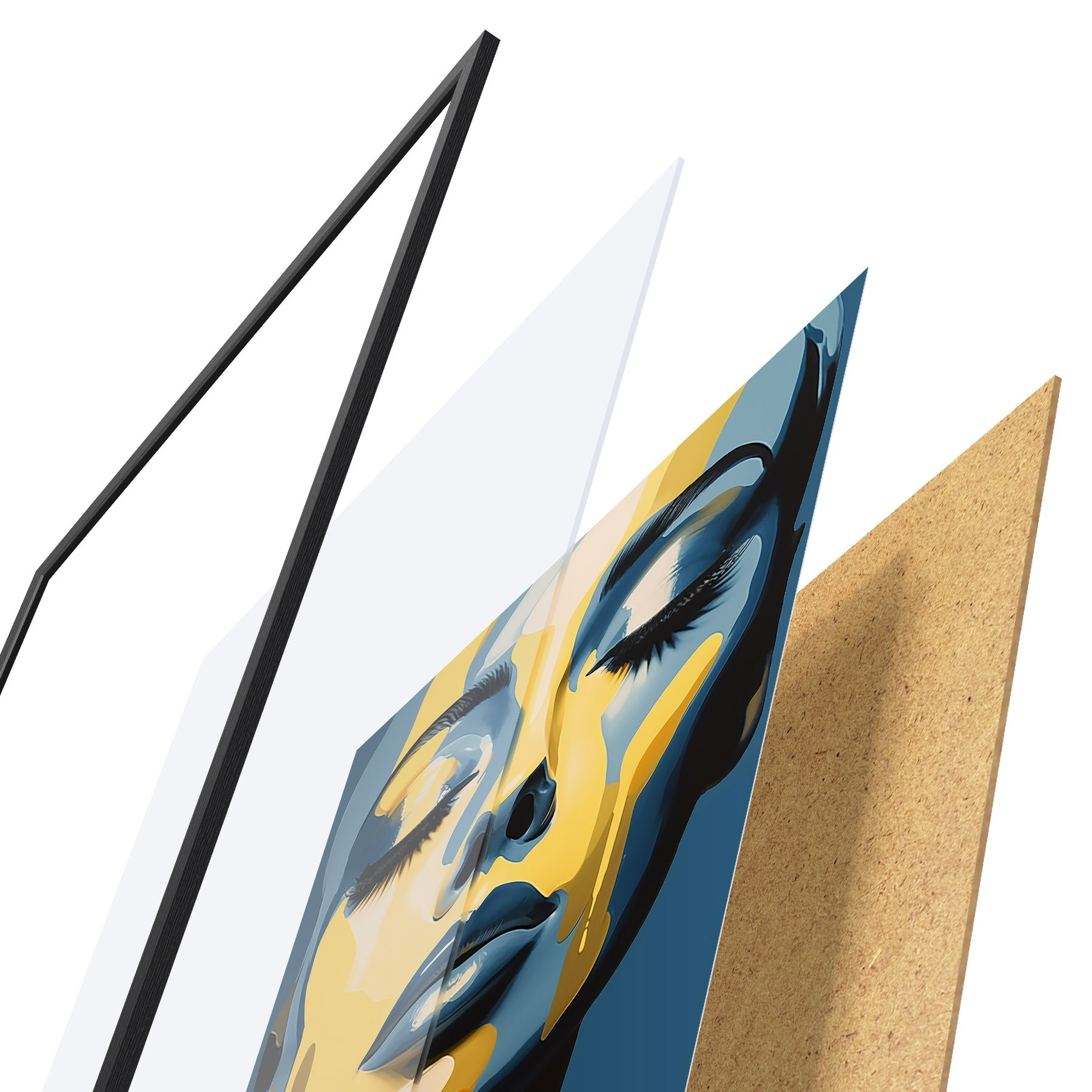 Le poster se compose d'un cadre, d'un plexiglas, d'une image imprimée et d'un support en aggloméré. Le poster peut être immédiatement accroché au mur grâce aux fixations au dos.