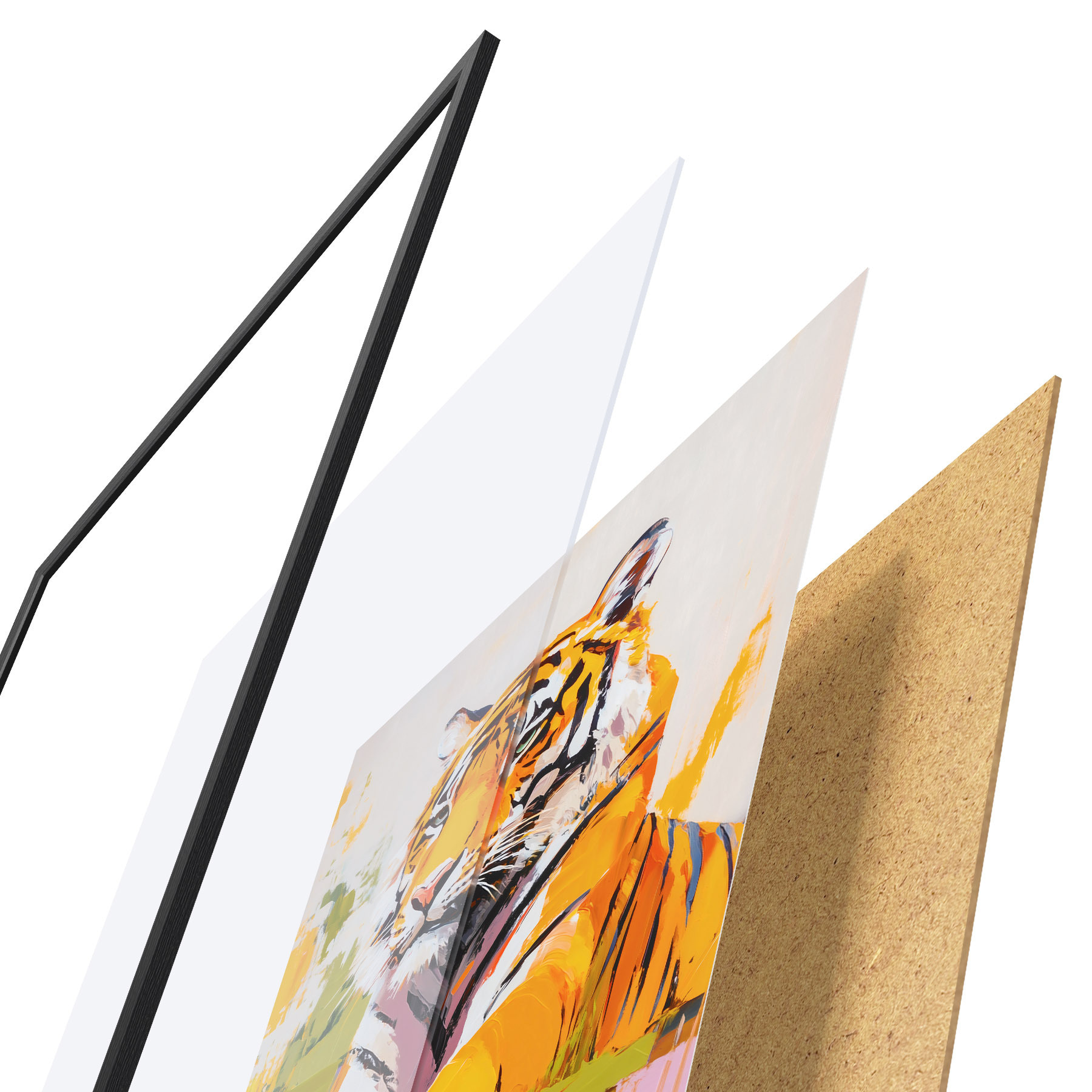 Le poster se compose d'un cadre, d'un plexiglas, d'une image imprimée et d'un support en aggloméré. Le poster peut être immédiatement accroché au mur grâce aux fixations au dos.