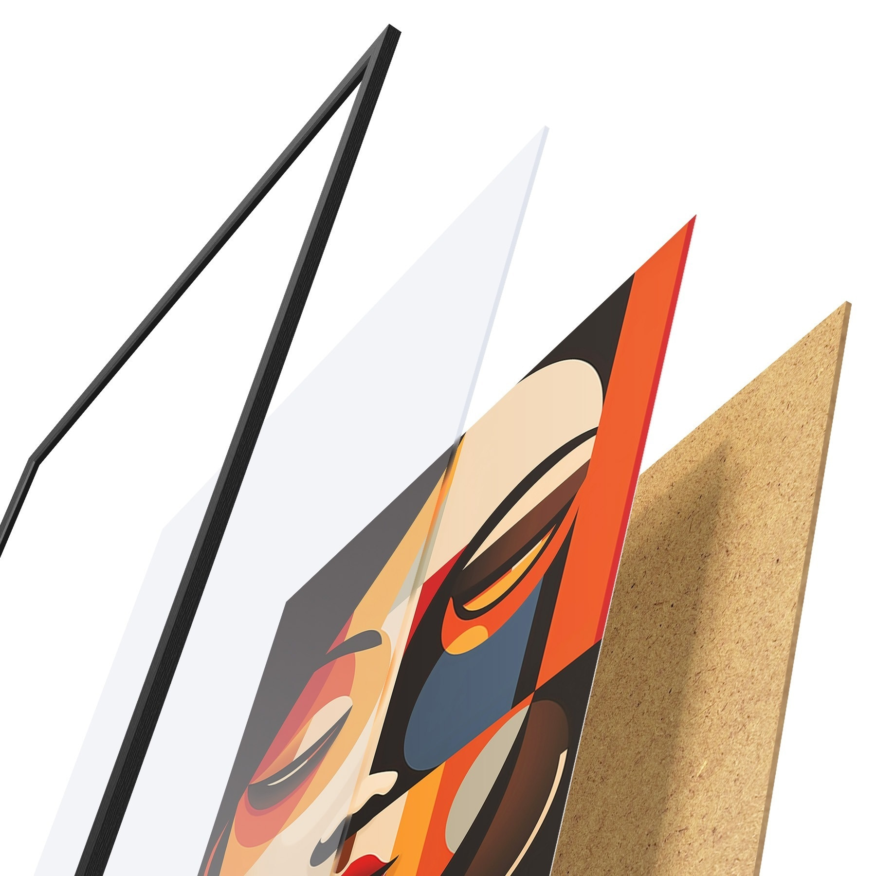 Le poster se compose d'un cadre, d'un plexiglas, d'une image imprimée et d'un support en aggloméré. Le poster peut être immédiatement accroché au mur grâce aux fixations au dos.