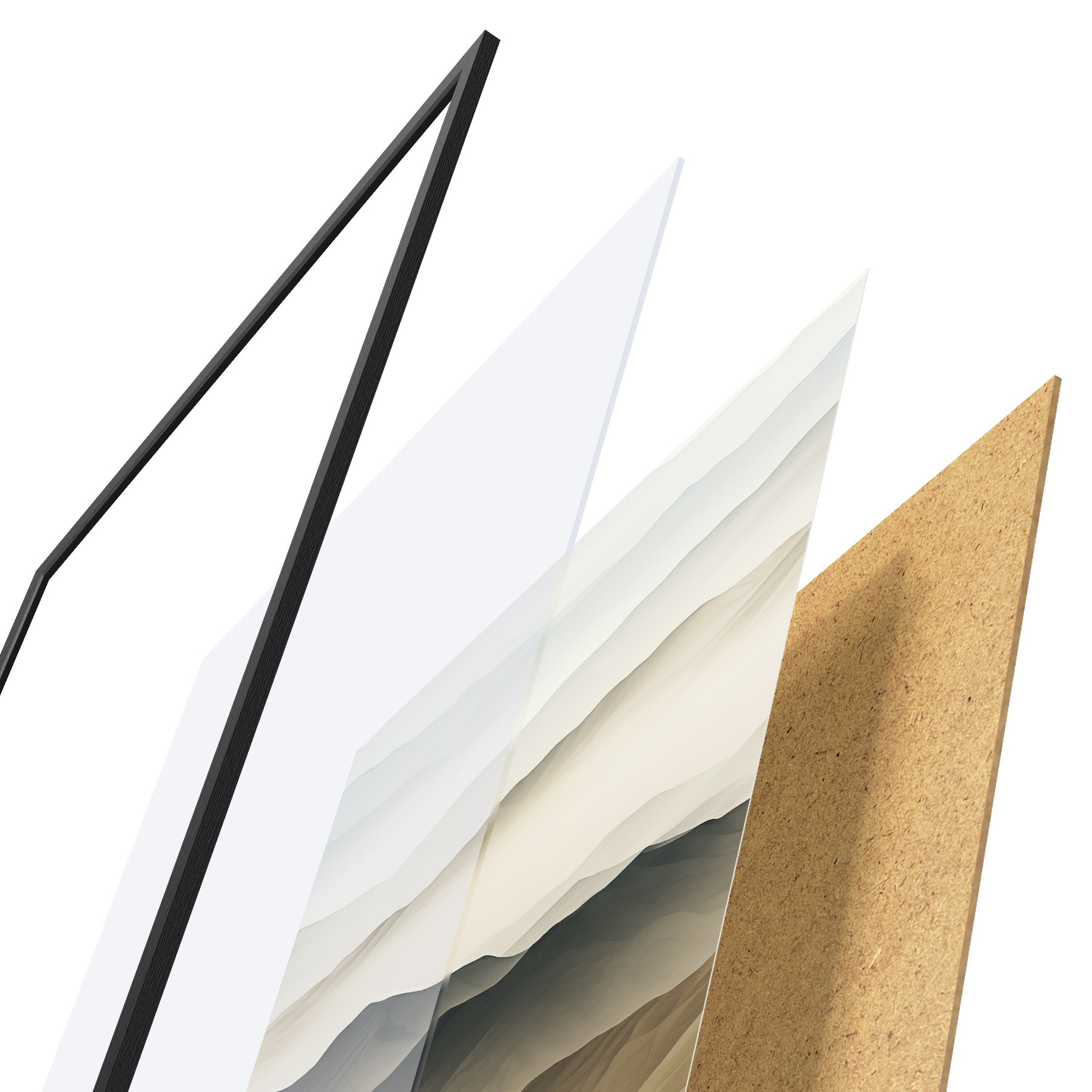 Le poster se compose d'un cadre, d'un plexiglas, d'une image imprimée et d'un support en aggloméré. Le poster peut être immédiatement accroché au mur grâce aux fixations au dos.