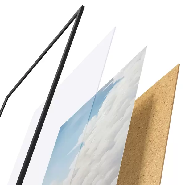 Le poster se compose d'un cadre, d'un plexiglas, d'une image imprimée et d'un support en aggloméré. Le poster peut être immédiatement accroché au mur grâce aux fixations au dos.