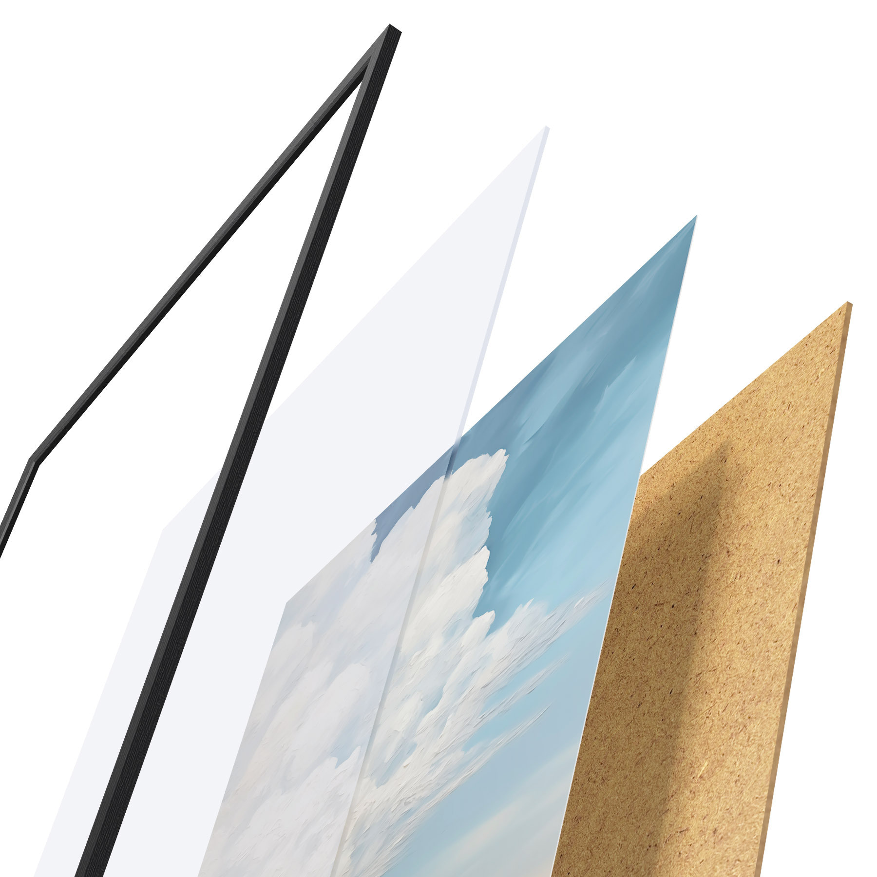 Le poster se compose d'un cadre, d'un plexiglas, d'une image imprimée et d'un support en aggloméré. Le poster peut être immédiatement accroché au mur grâce aux fixations au dos.