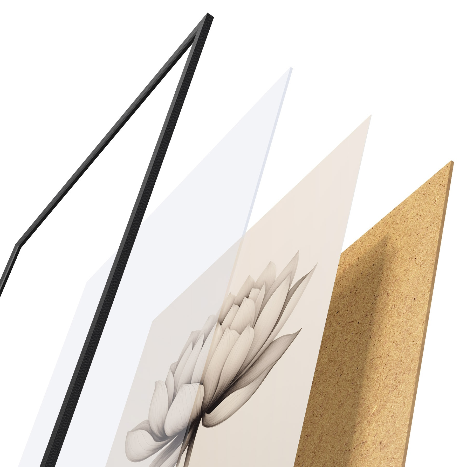 Le poster se compose d'un cadre, d'un plexiglas, d'une image imprimée et d'un support en aggloméré. Le poster peut être immédiatement accroché au mur grâce aux fixations au dos.