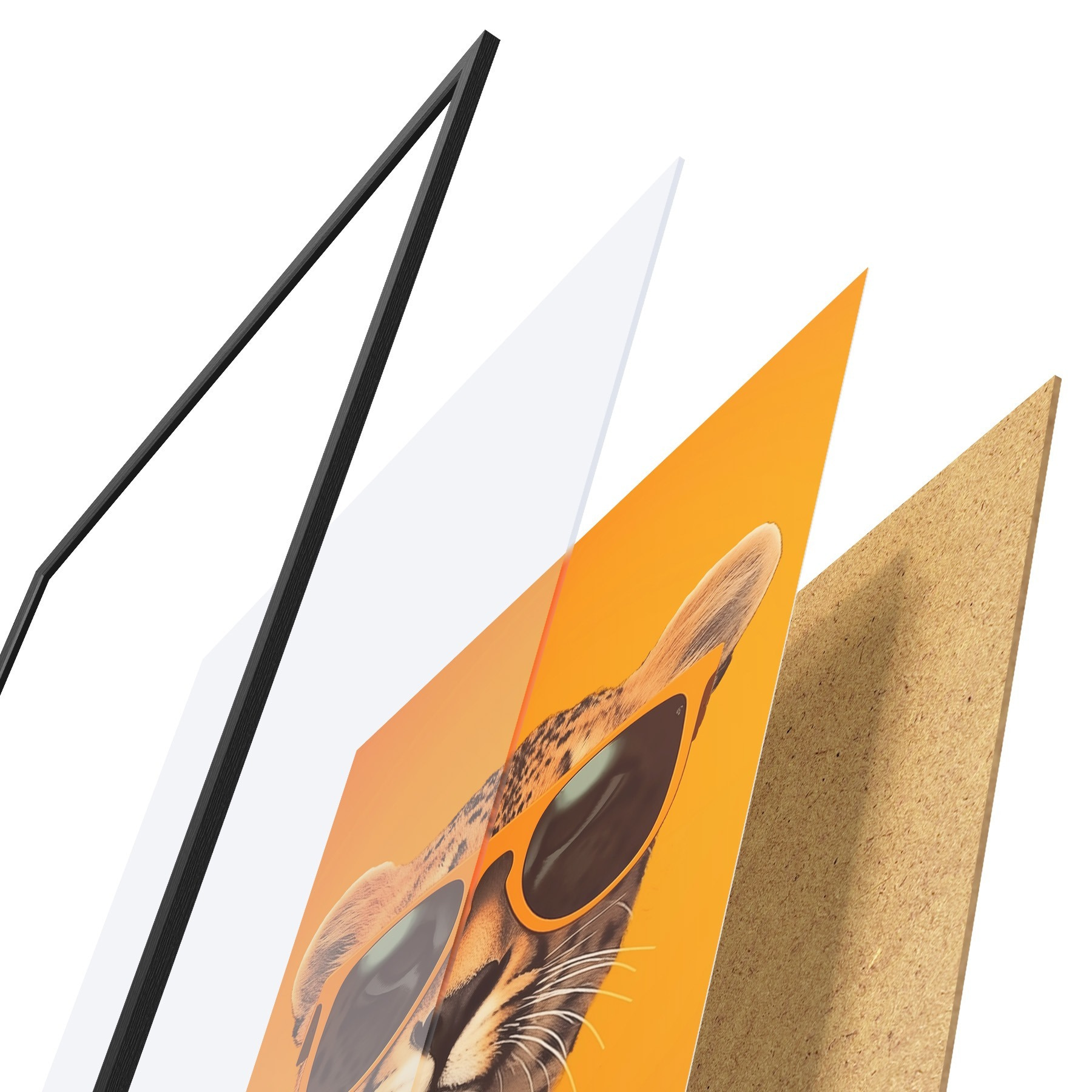 Le poster se compose d'un cadre, d'un plexiglas, d'une image imprimée et d'un support en aggloméré. Le poster peut être immédiatement accroché au mur grâce aux fixations au dos.