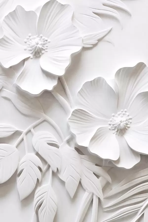 Affiche Fleurs blanches décoratives minimalistes avec feuilles, imitation relief, fond blanc Non f45179