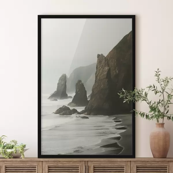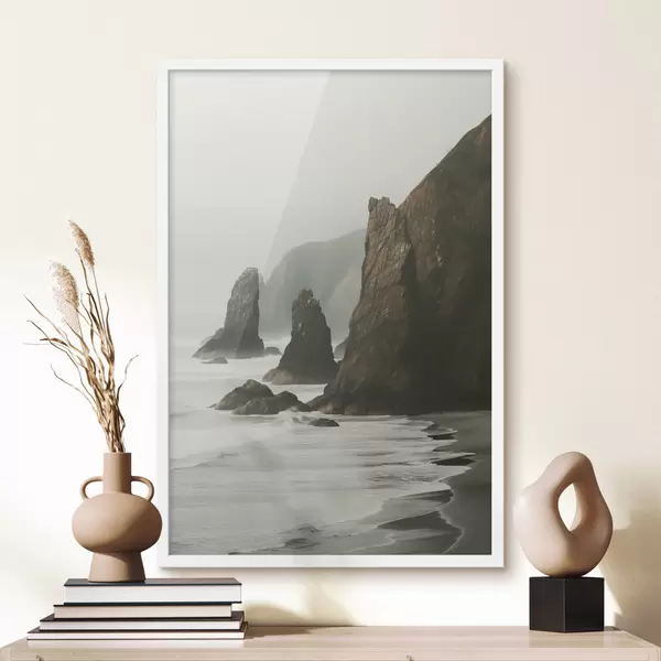 Affiche Falaises rocheuses et côte maritime, vagues s'écrasant sur le rivage, paysage à l'atmosphère lunatique, tons terreux f45193