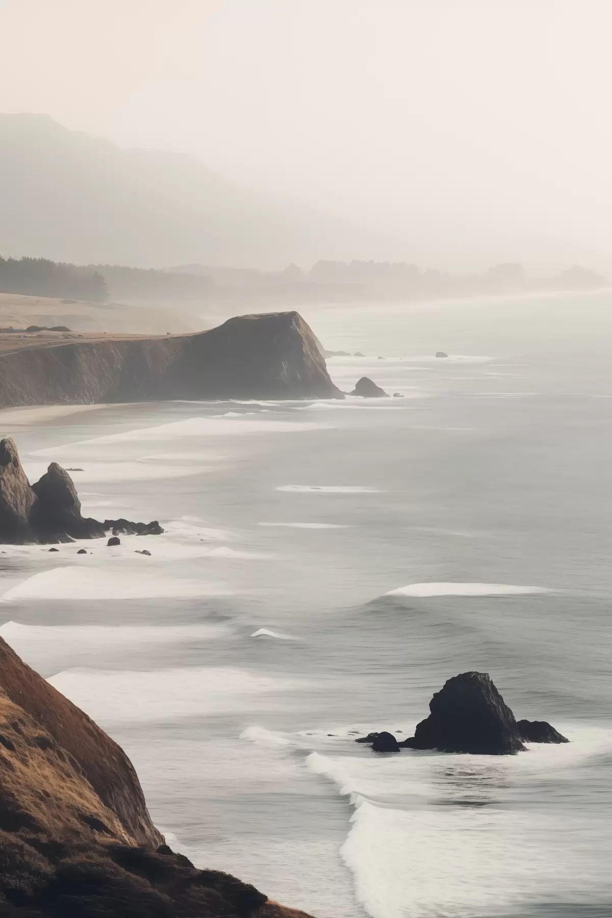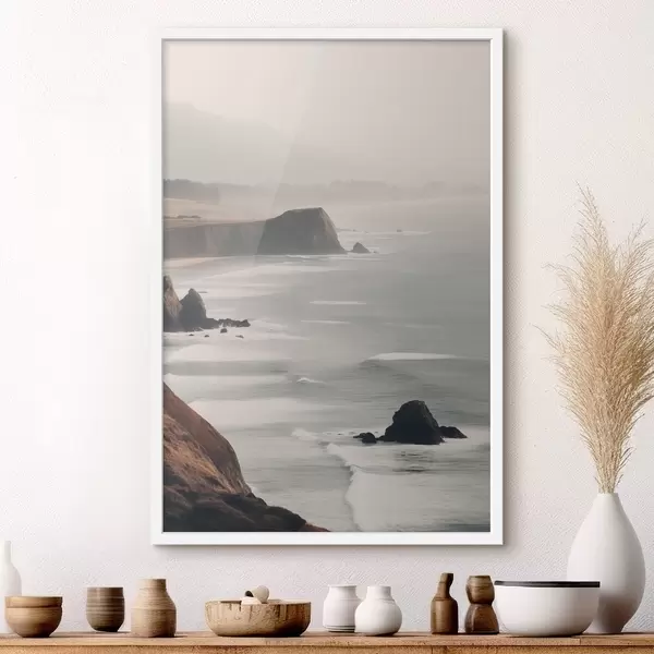 Affiche Falaises rocheuses et côte maritime, vagues s'écrasant sur le rivage, paysage à l'atmosphère lunatique, tons terreux Non f45194