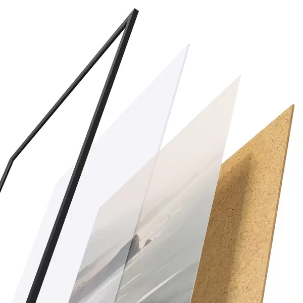 Le poster se compose d'un cadre, d'un plexiglas, d'une image imprimée et d'un support en aggloméré. Le poster peut être immédiatement accroché au mur grâce aux fixations au dos.
