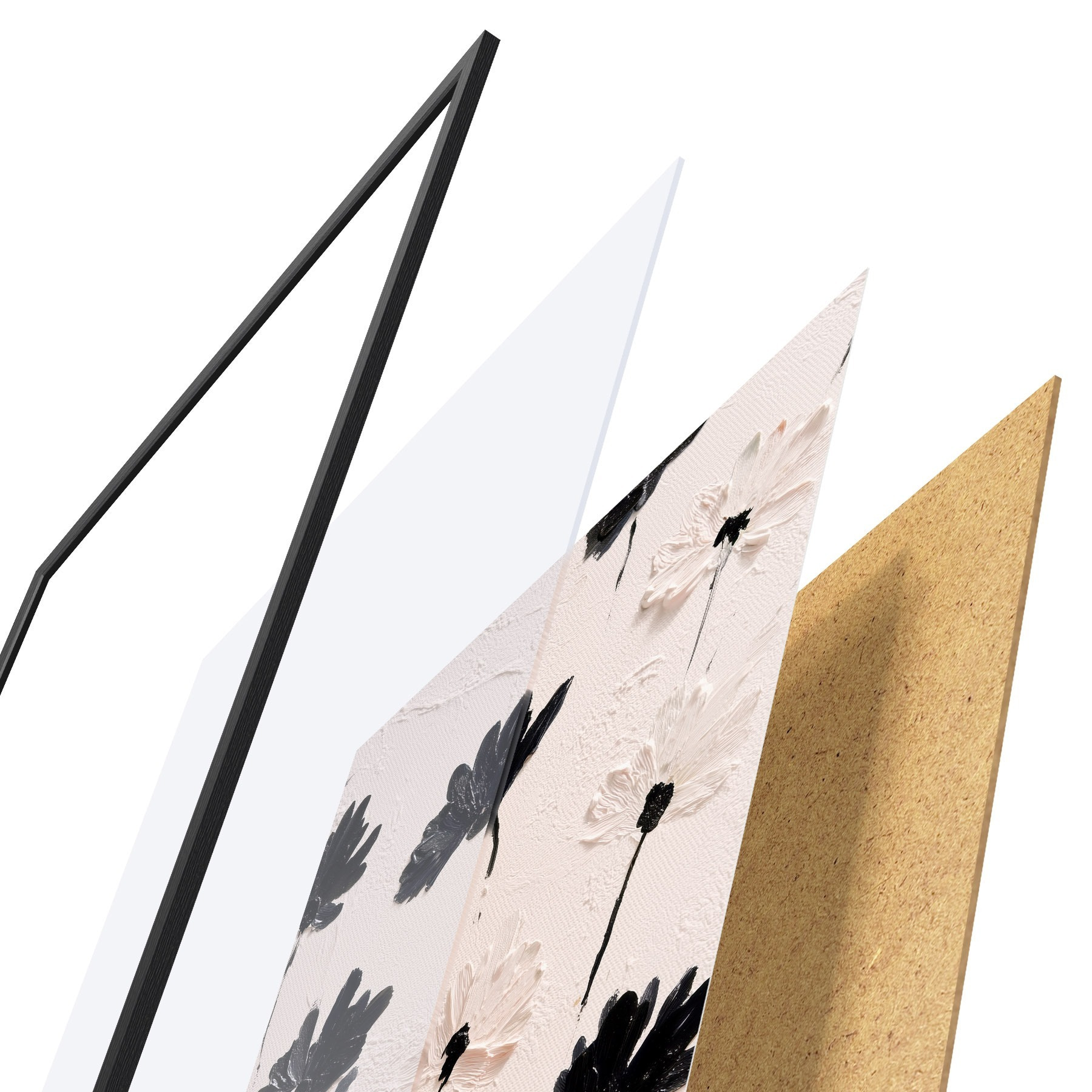 Le poster se compose d'un cadre, d'un plexiglas, d'une image imprimée et d'un support en aggloméré. Le poster peut être immédiatement accroché au mur grâce aux fixations au dos.