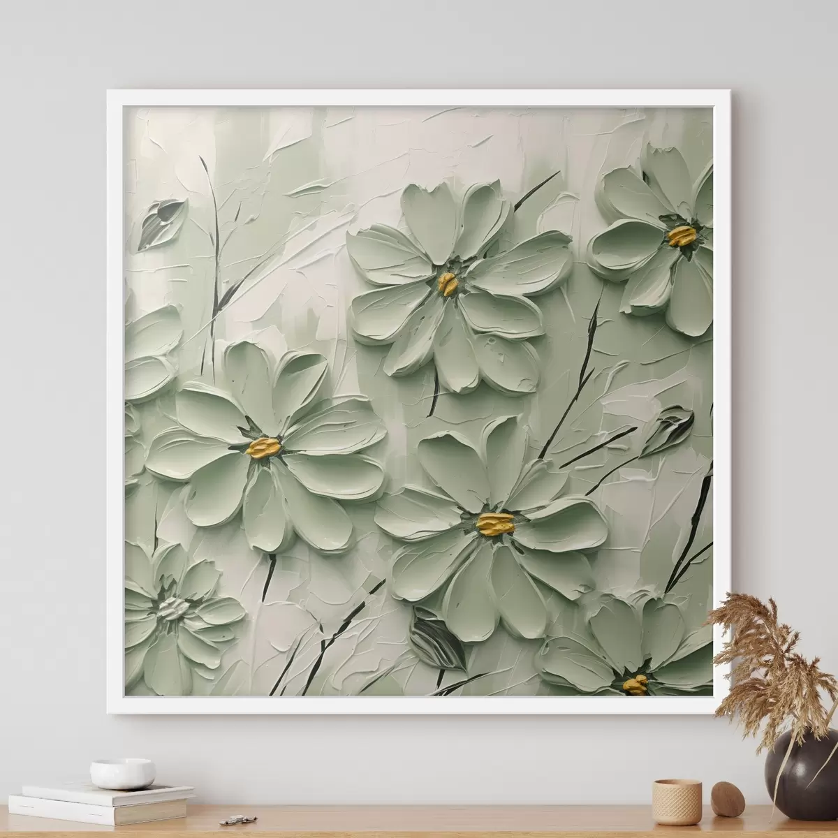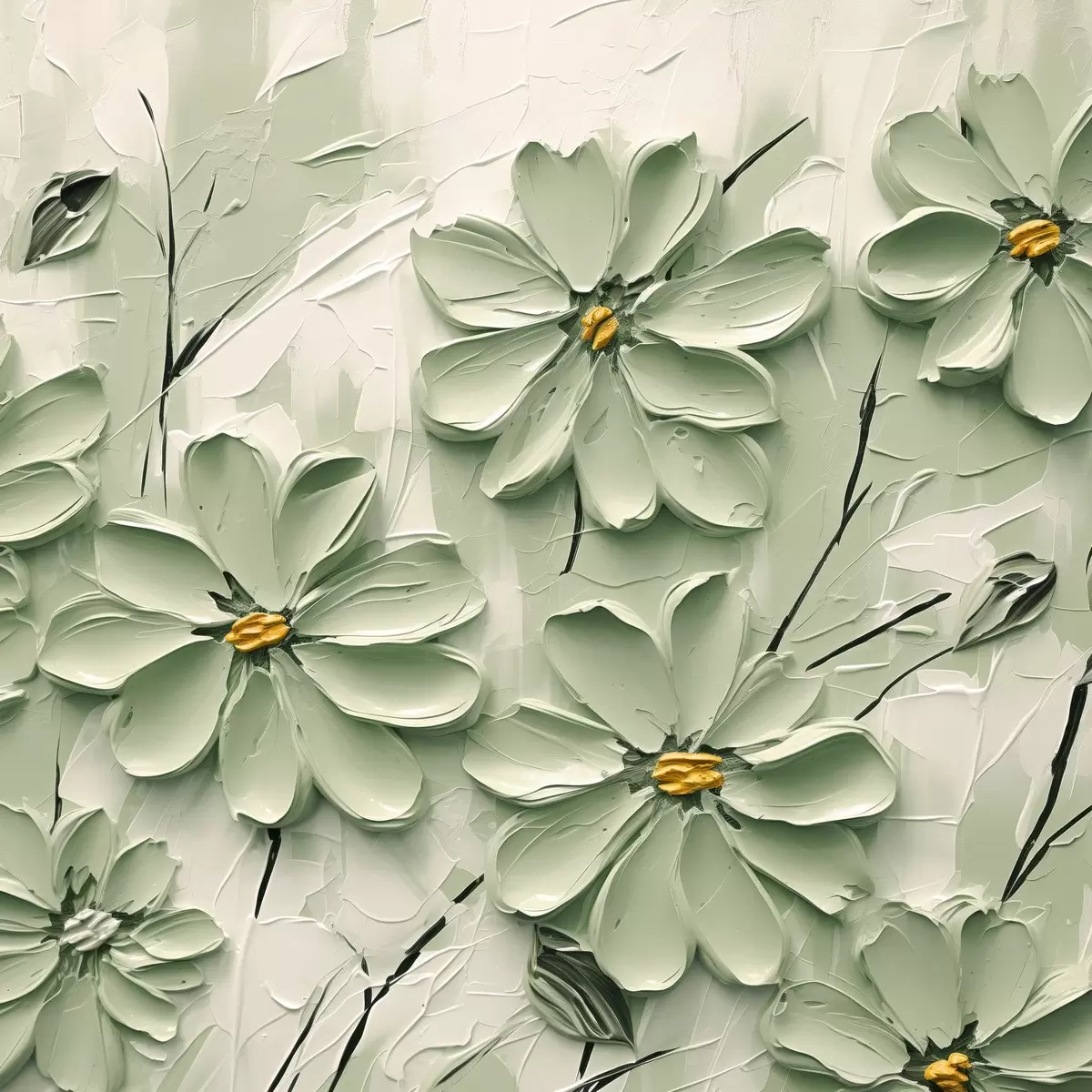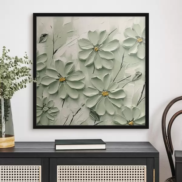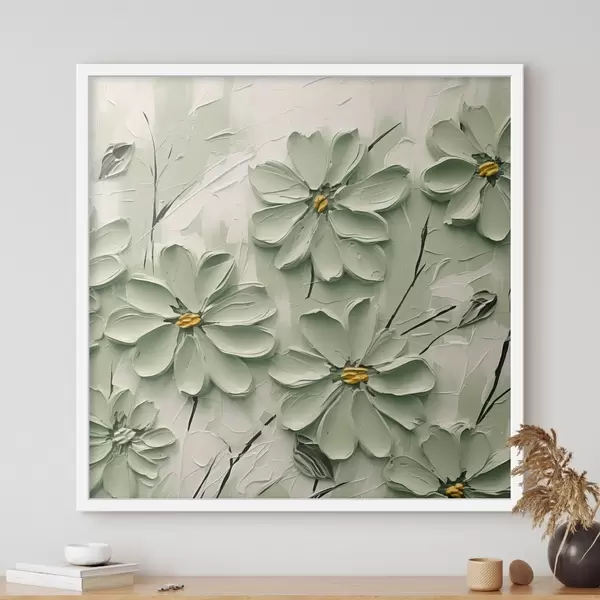Affiche Fleurs vertes à centre jaune peintes à grands coups de pinceau sur fond clair Non f45265