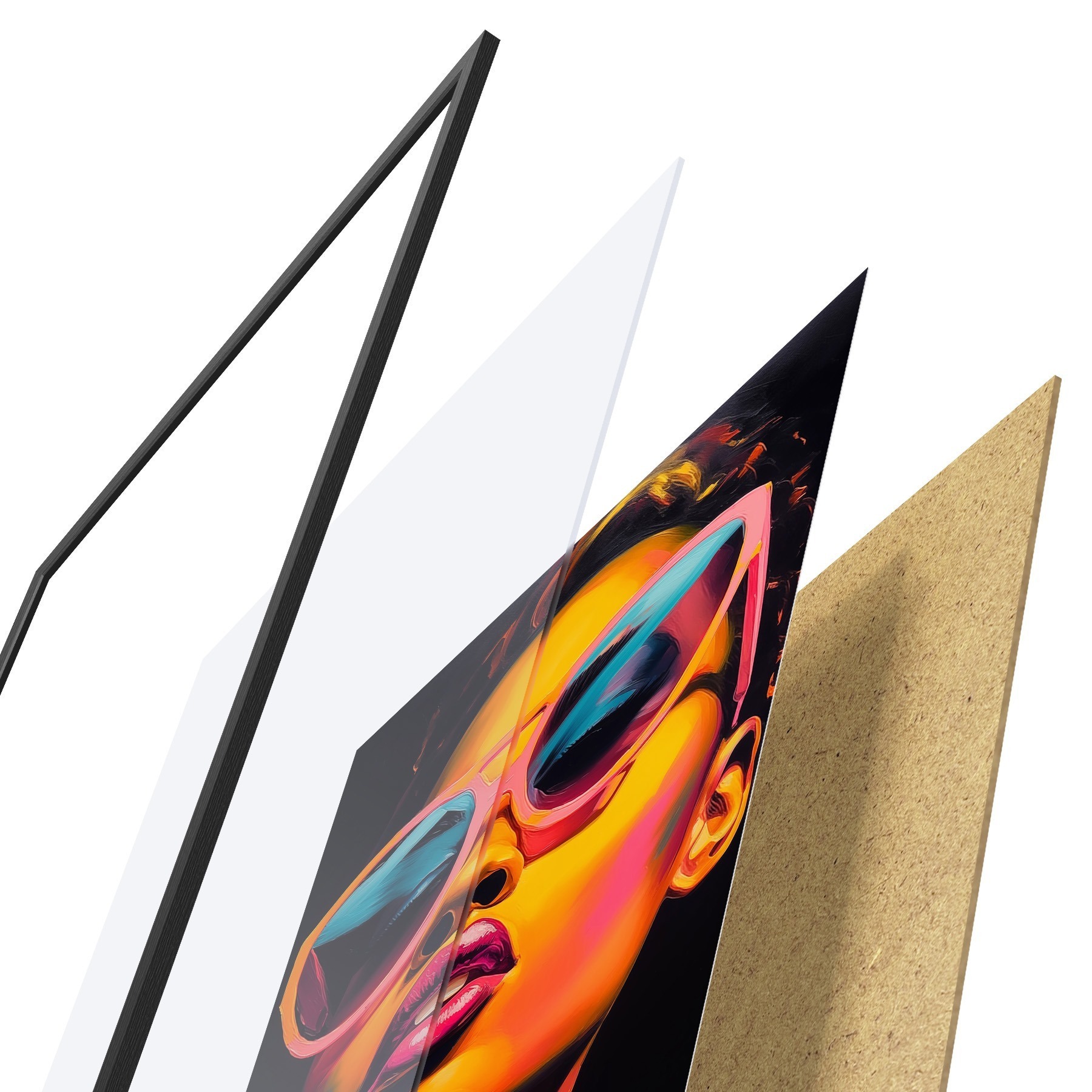 Le poster se compose d'un cadre, d'un plexiglas, d'une image imprimée et d'un support en aggloméré. Le poster peut être immédiatement accroché au mur grâce aux fixations au dos.