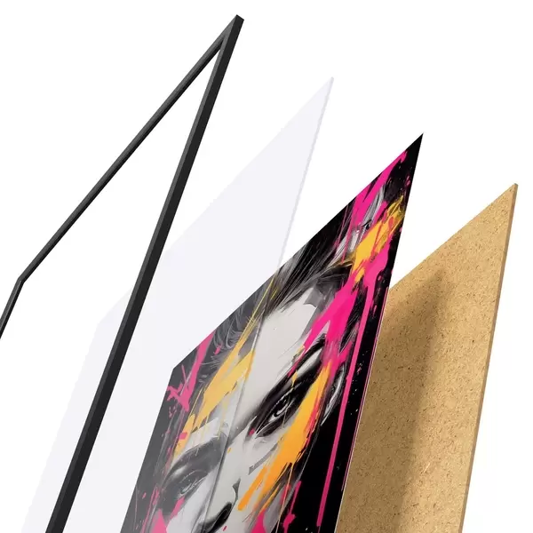 Le poster se compose d'un cadre, d'un plexiglas, d'une image imprimée et d'un support en aggloméré. Le poster peut être immédiatement accroché au mur grâce aux fixations au dos.