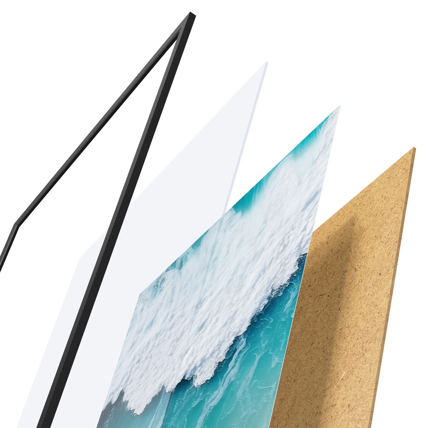 Le poster se compose d'un cadre, d'un plexiglas, d'une image imprimée et d'un support en aggloméré. Le poster peut être immédiatement accroché au mur grâce aux fixations au dos.
