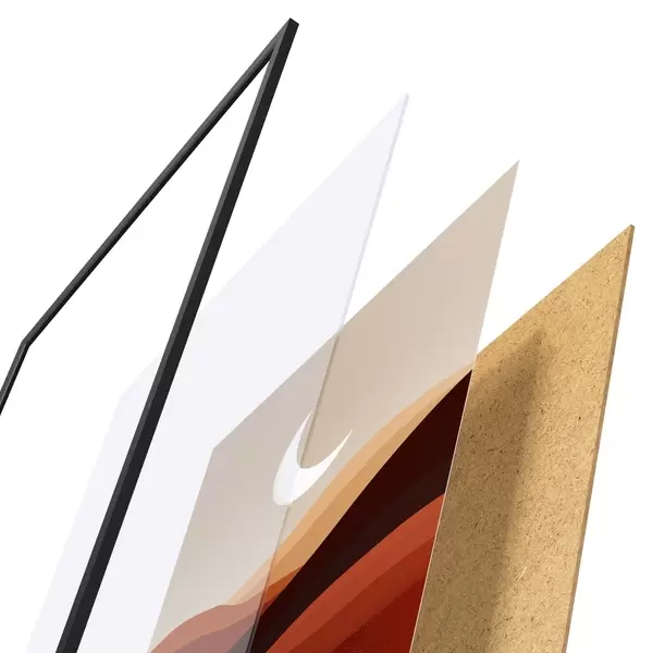 Le poster se compose d'un cadre, d'un plexiglas, d'une image imprimée et d'un support en aggloméré. Le poster peut être immédiatement accroché au mur grâce aux fixations au dos.