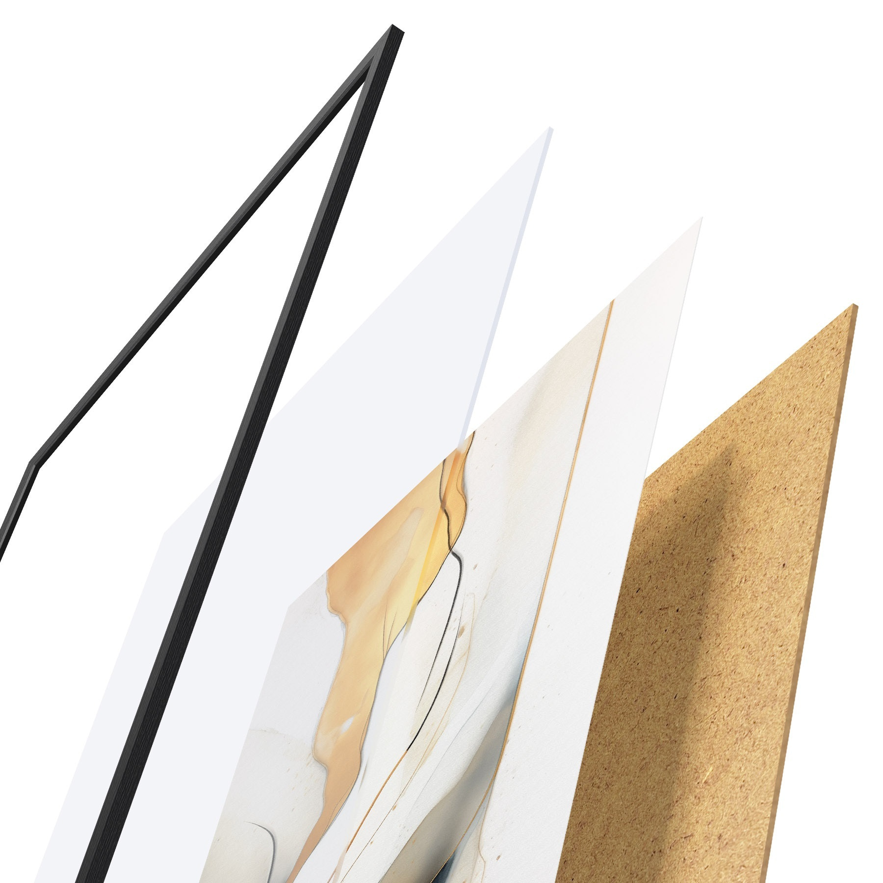 Le poster se compose d'un cadre, d'un plexiglas, d'une image imprimée et d'un support en aggloméré. Le poster peut être immédiatement accroché au mur grâce aux fixations au dos.