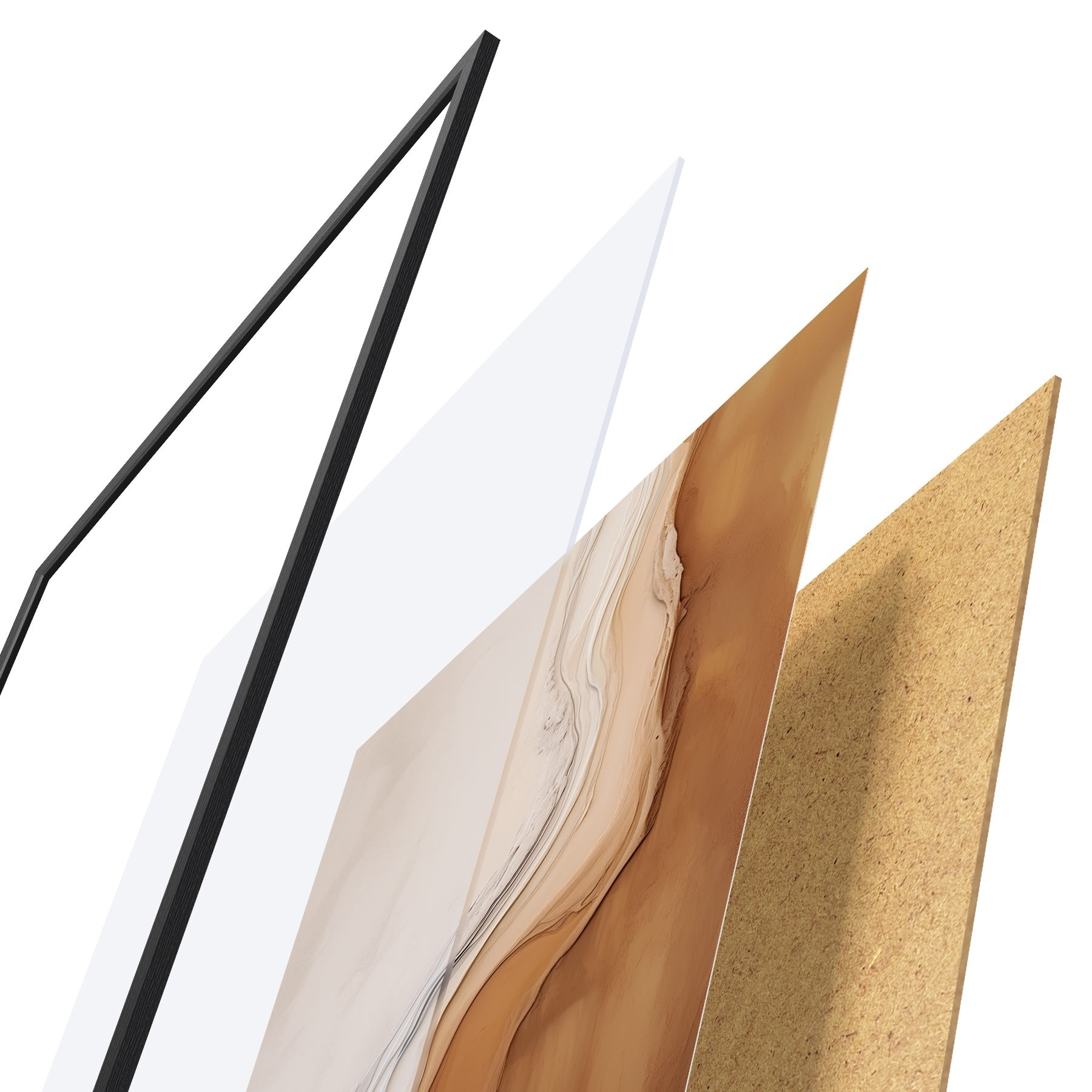 Le poster se compose d'un cadre, d'un plexiglas, d'une image imprimée et d'un support en aggloméré. Le poster peut être immédiatement accroché au mur grâce aux fixations au dos.