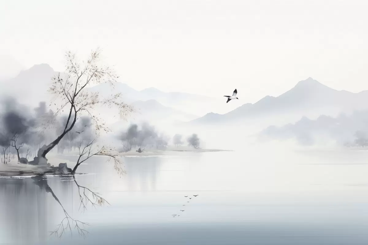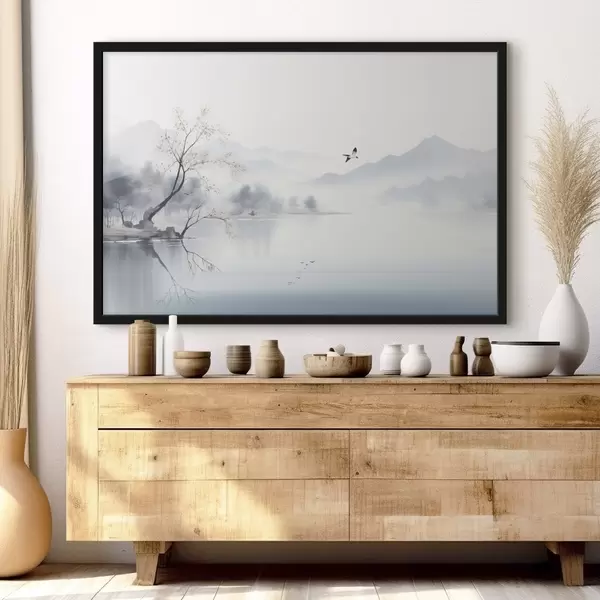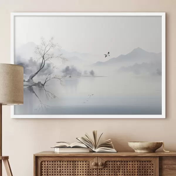 Affiche Paysage brumeux avec un arbre, des montagnes et des oiseaux Non f45518