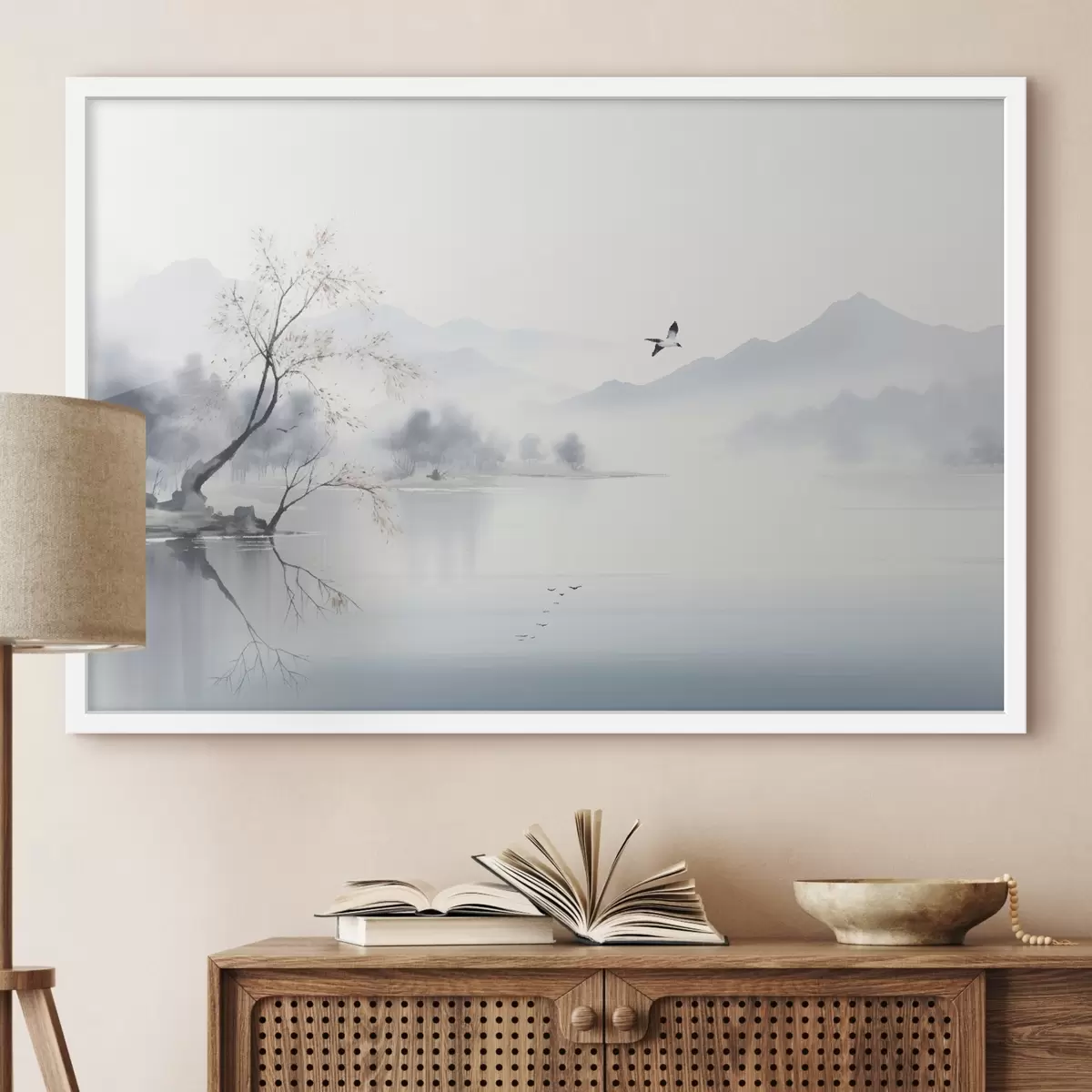 Affiche Paysage brumeux avec un arbre, des montagnes et des oiseaux f45518