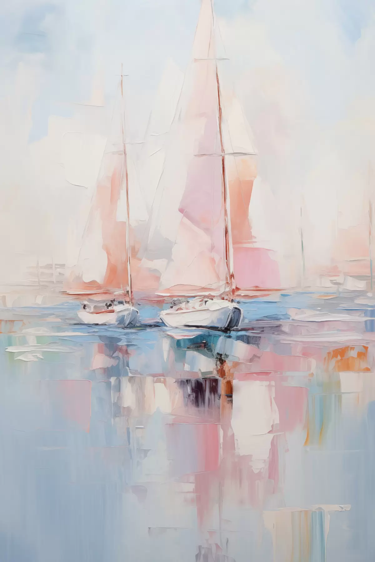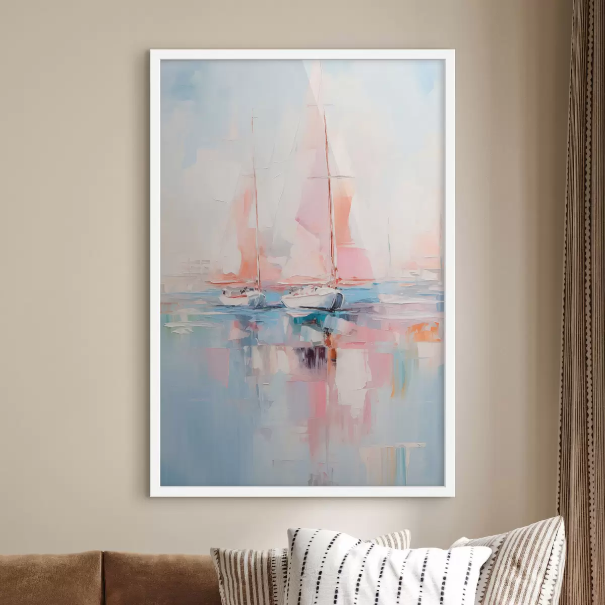 Affiche Voiliers aux voiles roses flottant sur une mer calme, reflets des bateaux dans l'eau, couleurs douces et pastel f45557