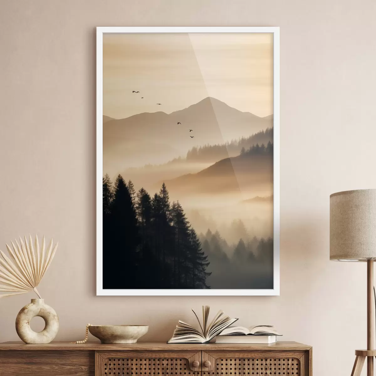 Affiche Un paysage de montagne avec une forêt et des oiseaux volant dans le ciel, le tout recouvert d'une épaisse couche de brouillard au lever du soleil f45563
