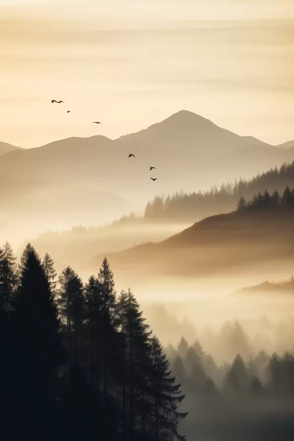 Affiche Un paysage de montagne avec une forêt et des oiseaux volant dans le ciel, le tout recouvert d'une épaisse couche de brouillard au lever du soleil f45563