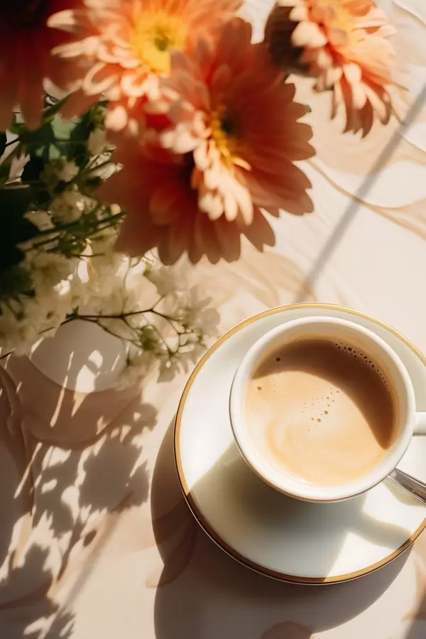 Affiche Une tasse de café avec de la mousse sur une assiette blanche, quelques fleurs en arrière-plan, avec la lumière du soleil Non f45570
