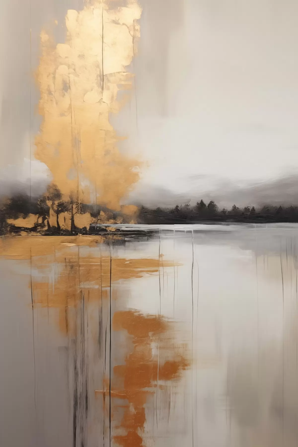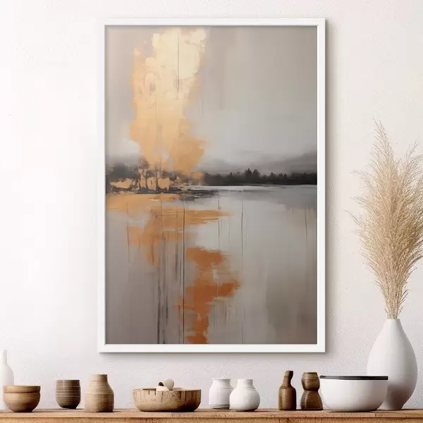 Affiche Un paysage abstrait avec un lac, un arbre et un brouillard jaune, l'eau se reflète et le ciel est nuageux Non f45575