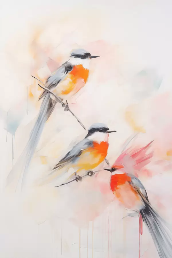 Affiche Oiseaux perchés sur des branches, couleurs douces et pastel, fond clair avec des teintes roses et blanches Non f45577