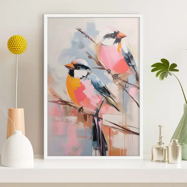 Affiche Oiseaux colorés perchés sur une branche sur un fond doux aux couleurs pastel f45578
