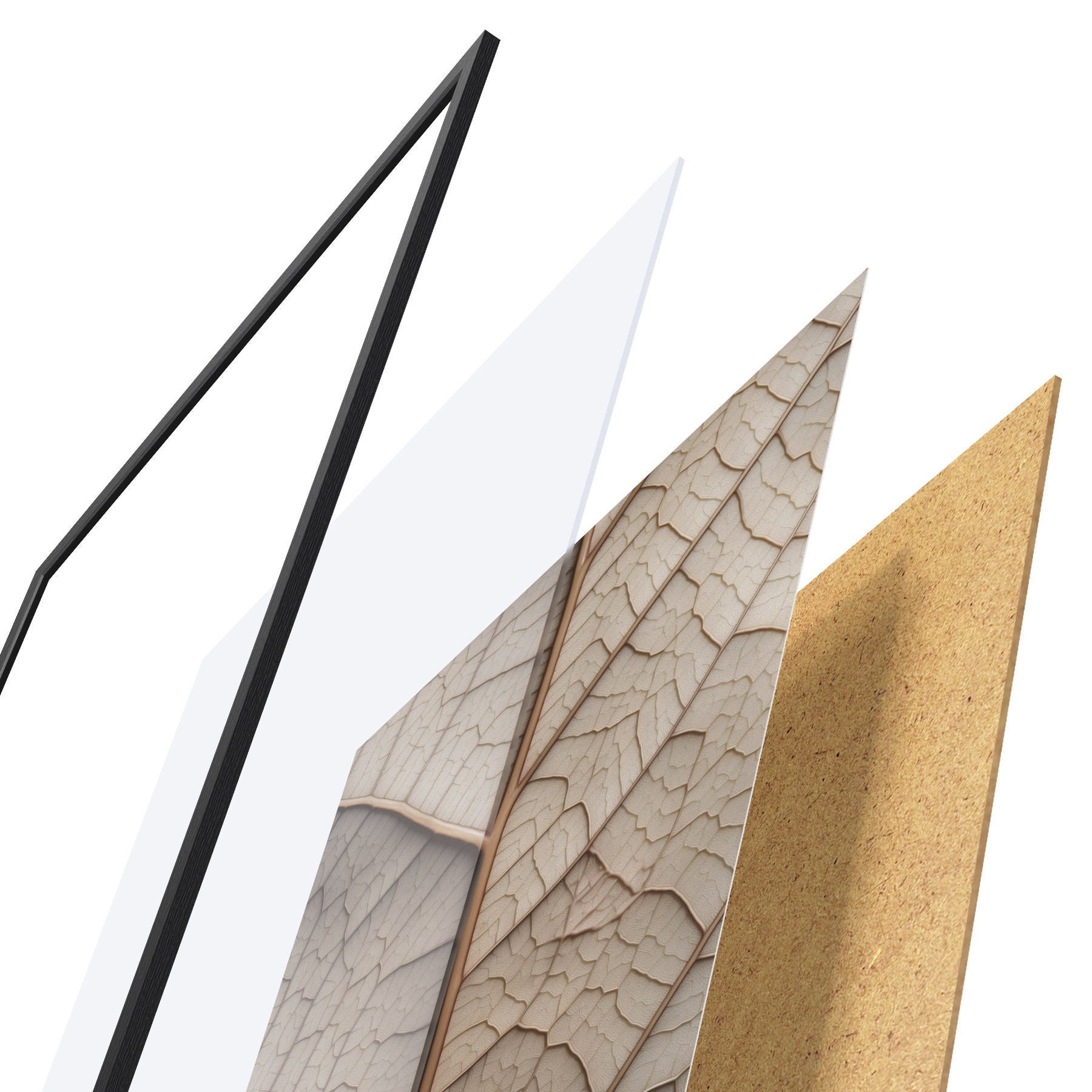 Le poster se compose d'un cadre, d'un plexiglas, d'une image imprimée et d'un support en aggloméré. Le poster peut être immédiatement accroché au mur grâce aux fixations au dos.