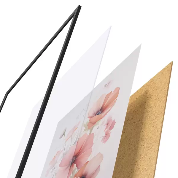 Le poster se compose d'un cadre, d'un plexiglas, d'une image imprimée et d'un support en aggloméré. Le poster peut être immédiatement accroché au mur grâce aux fixations au dos.
