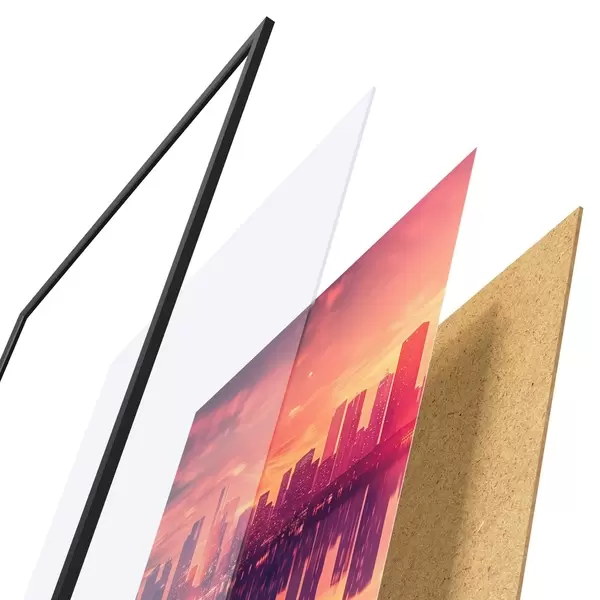 Le poster se compose d'un cadre, d'un plexiglas, d'une image imprimée et d'un support en aggloméré. Le poster peut être immédiatement accroché au mur grâce aux fixations au dos.