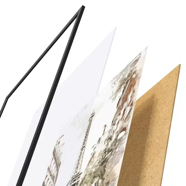 Le poster se compose d'un cadre, d'un plexiglas, d'une image imprimée et d'un support en aggloméré. Le poster peut être immédiatement accroché au mur grâce aux fixations au dos.