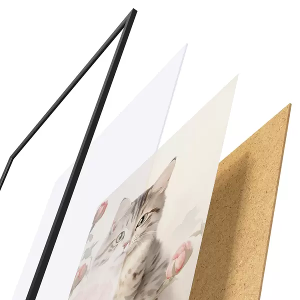Le poster se compose d'un cadre, d'un plexiglas, d'une image imprimée et d'un support en aggloméré. Le poster peut être immédiatement accroché au mur grâce aux fixations au dos.