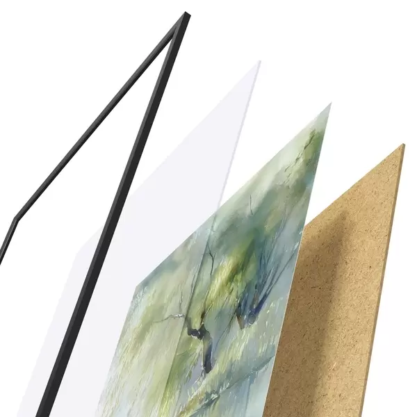 Le poster se compose d'un cadre, d'un plexiglas, d'une image imprimée et d'un support en aggloméré. Le poster peut être immédiatement accroché au mur grâce aux fixations au dos.