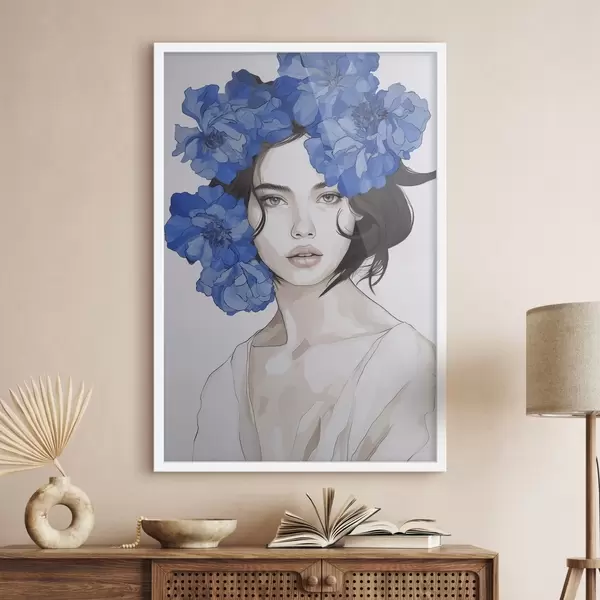Affiche Portrait d'une jeune fille avec des fleurs bleues Non f45756