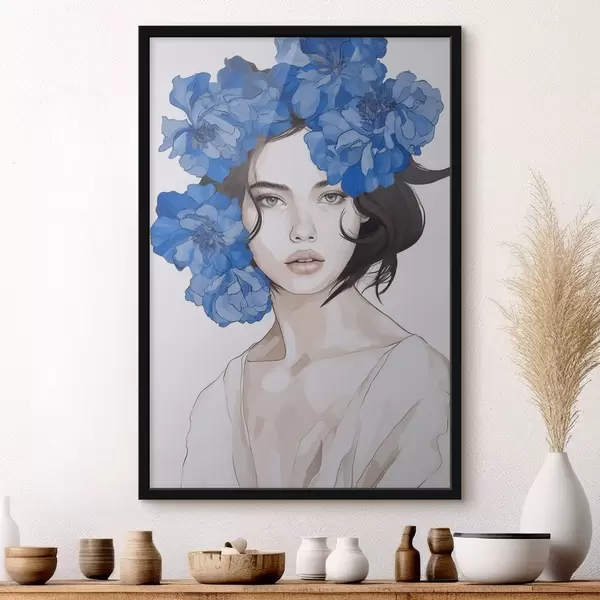 Affiche Portrait d'une jeune fille avec des fleurs bleues f45756