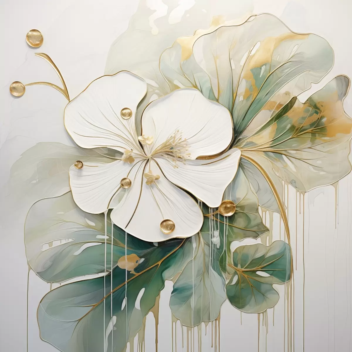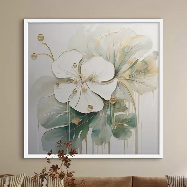 Affiche Une fleur blanche avec des détails jaune-orange et des feuilles vertes Non f45815