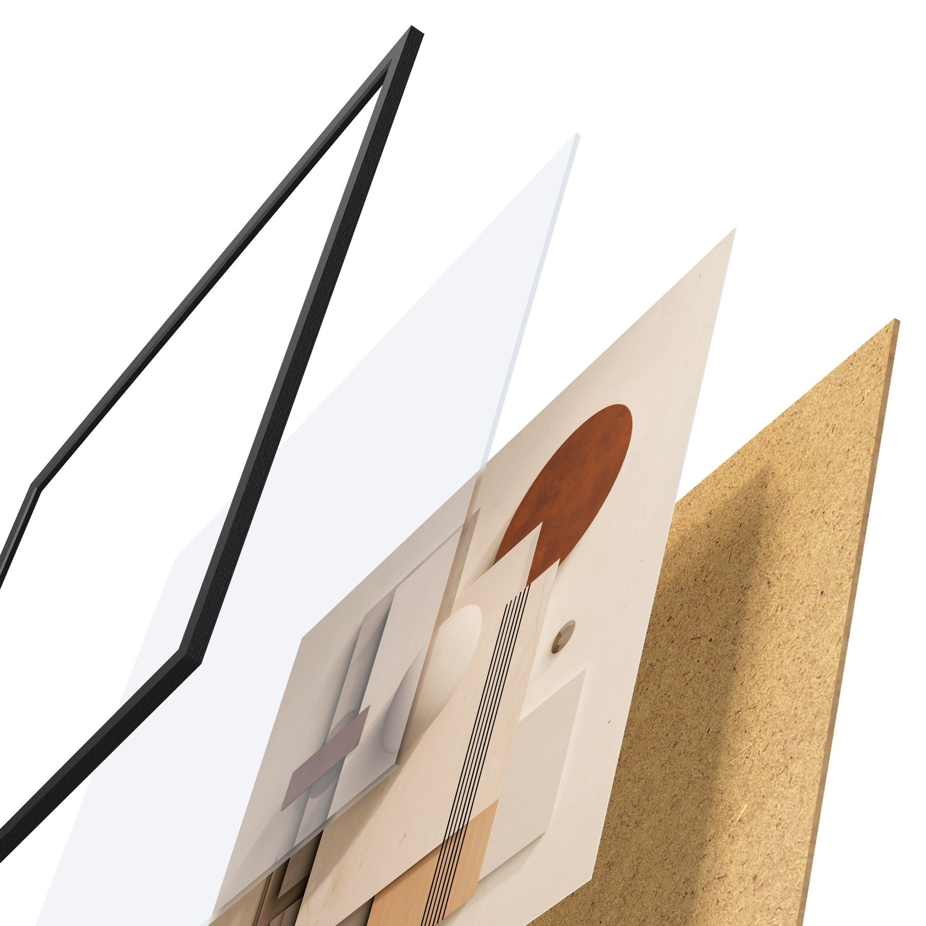 Le poster se compose d'un cadre, d'un plexiglas, d'une image imprimée et d'un support en aggloméré. Le poster peut être immédiatement accroché au mur grâce aux fixations au dos.