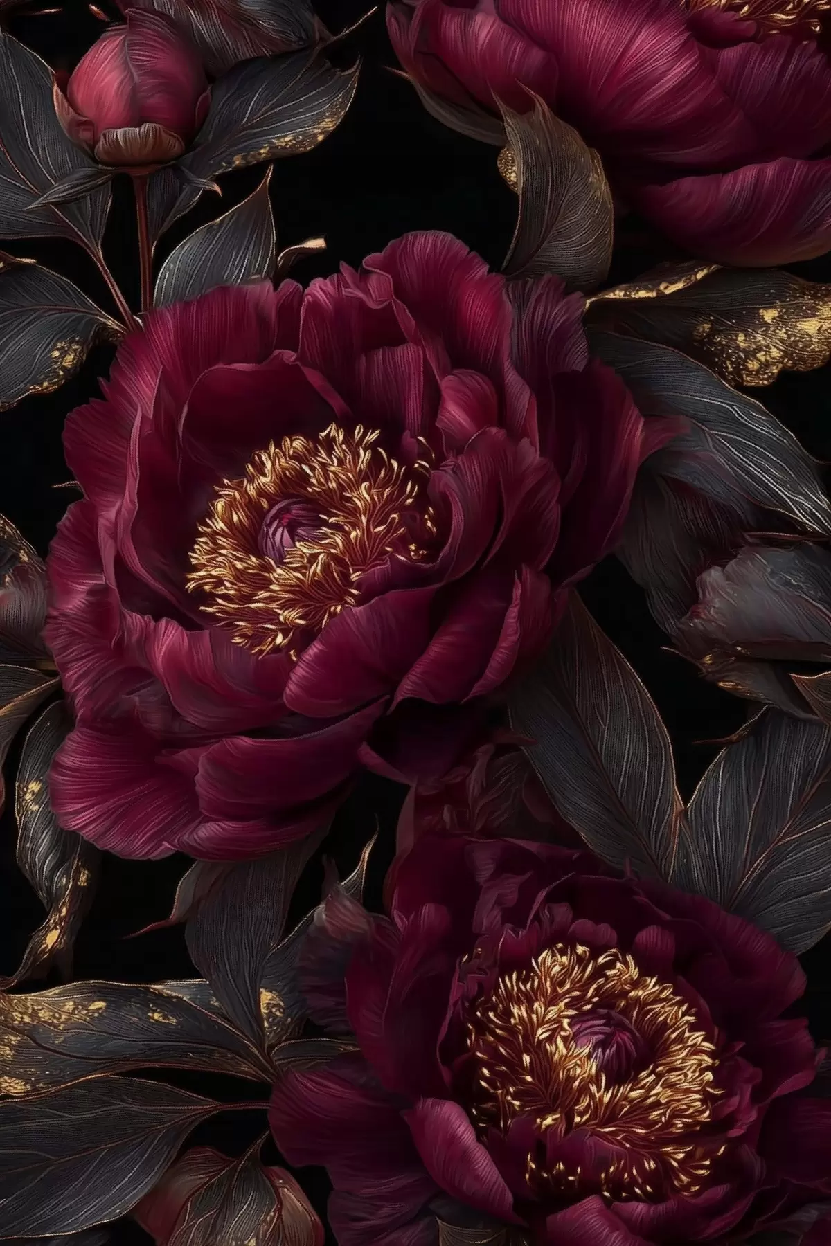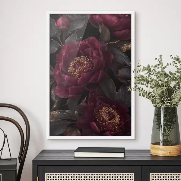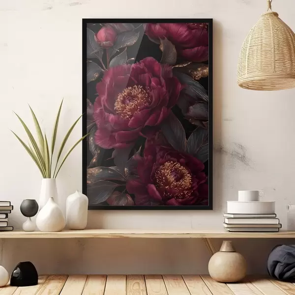 Affiche Pivoines bordeaux sur fond noir avec des touches de jaune f45877
