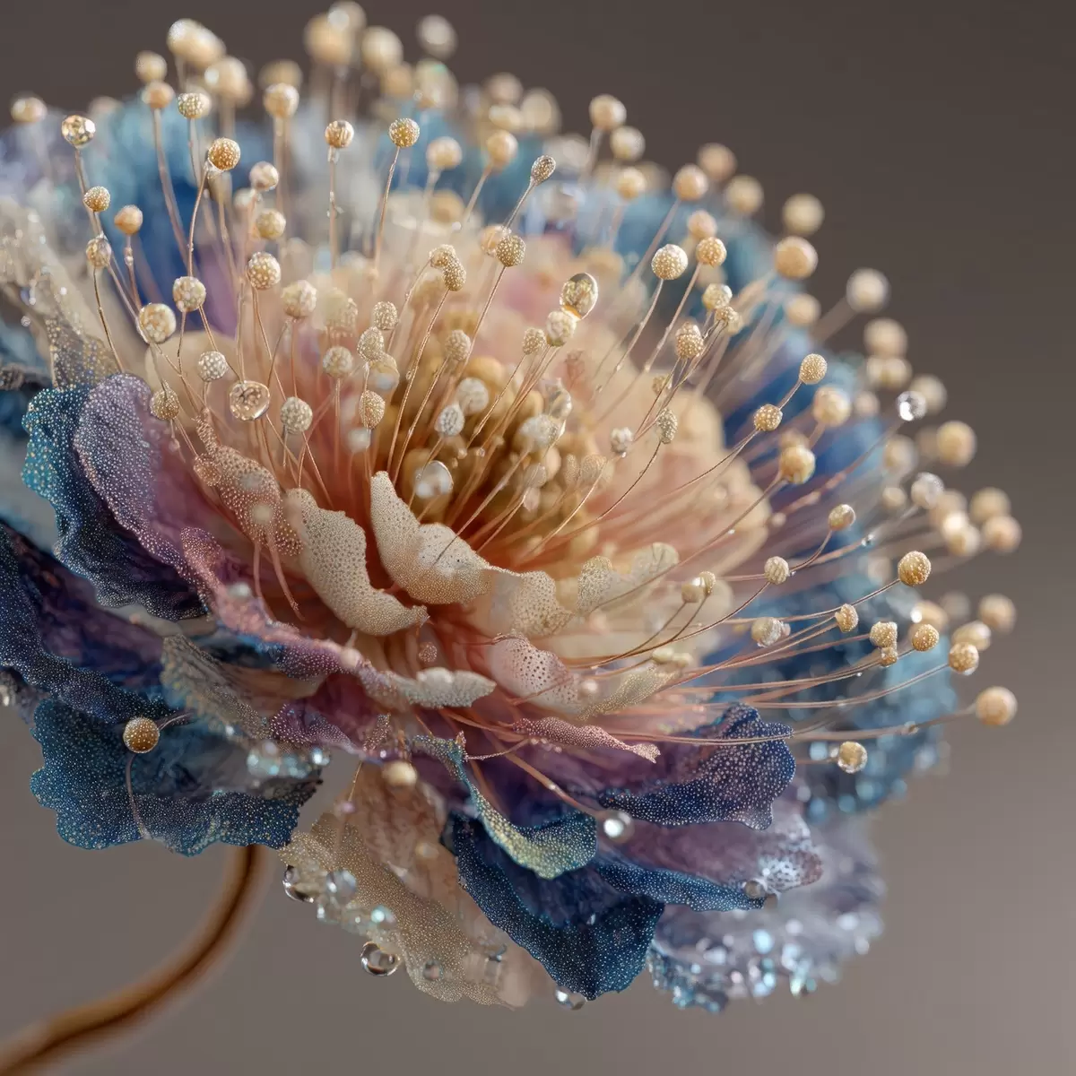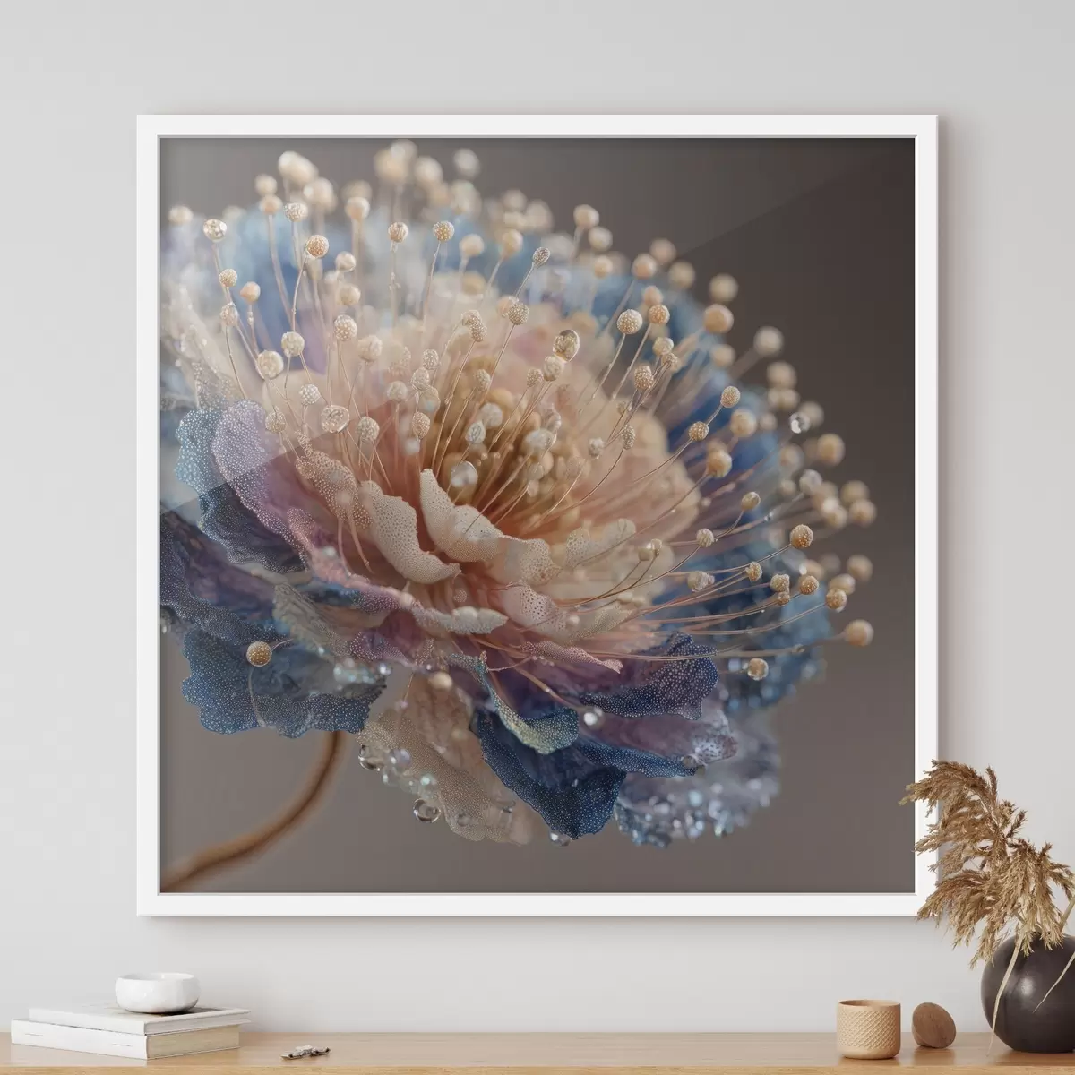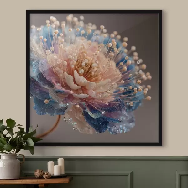 Affiche Fleur nacrée avec des gouttes de rosée, pétales couleur pêche et bleu Non f45911