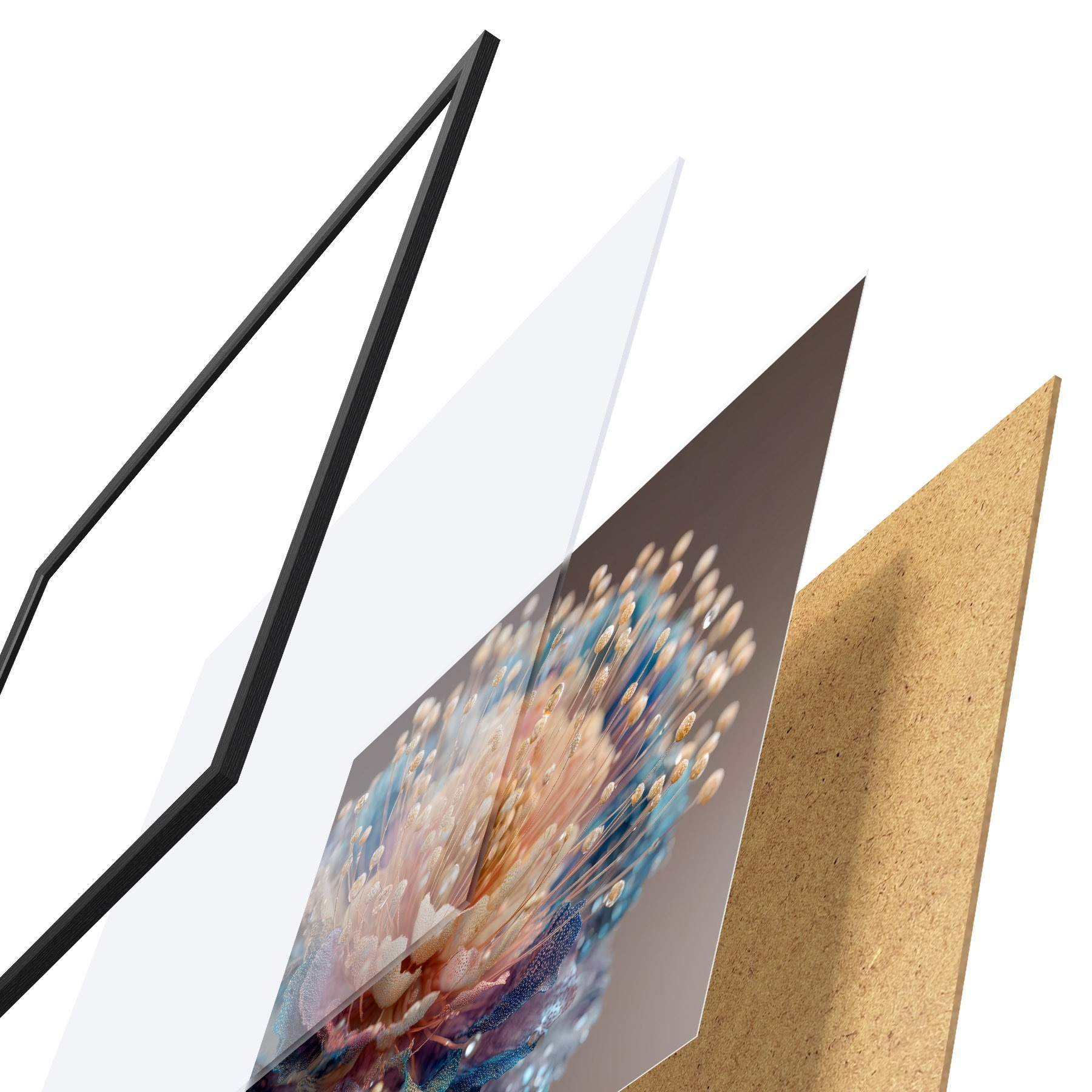 Le poster se compose d'un cadre, d'un plexiglas, d'une image imprimée et d'un support en aggloméré. Le poster peut être immédiatement accroché au mur grâce aux fixations au dos.