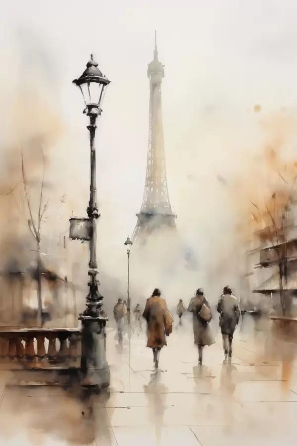 Affiche Une journée pluvieuse d'automne à Paris avec la Tour Eiffel en arrière-plan et des lampadaires vintage f45931